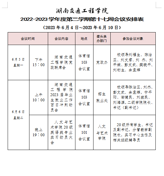 beat365唯一官方网站2022-2023学年度第二学期第十七周会议安排表