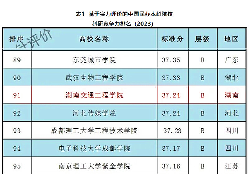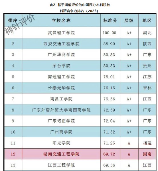 2023基于增值评价的中国民办本科院校科研竞争力排名C+级及以上(前50%)的高校共96所,beat365唯一官方网站继2022年竞争力入选A级排名12的基础上,以69.72分(标准分100分),再次入选A级、位居《基于增值评价的中国民办本科院校科研竞争力排名》(数据有效期是2018-2022年)第12名、湖南省第1位。