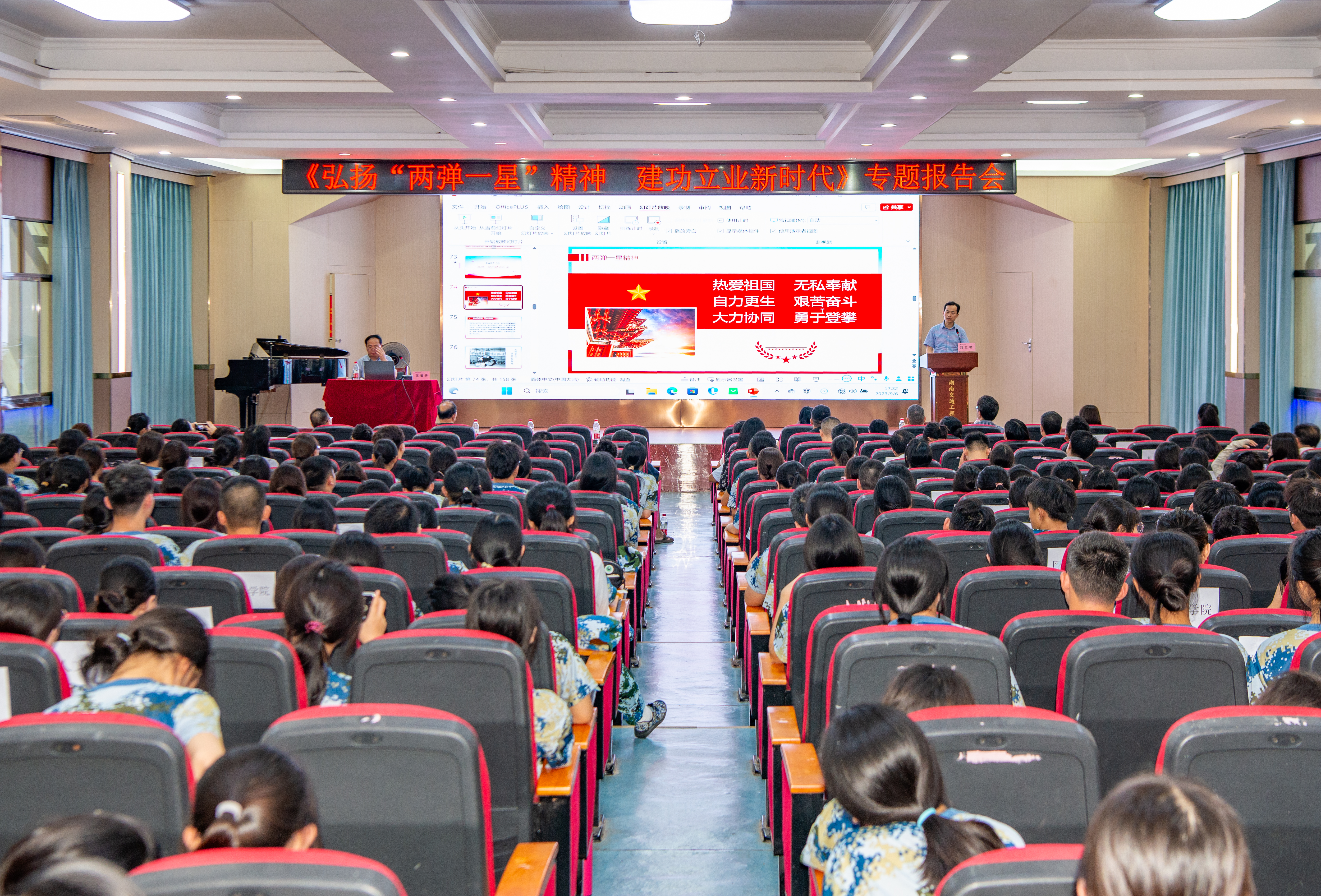 范校长的报告视野开阔、内容充实、精彩纷呈、沁人心脾。他用鲜活的事例为师生演绎了什么是“两弹一星”精神,阐释了“两弹一星”对我国政治、经济、文化及外交的重大意义。用通俗易懂的语言,把深奥的物理知识与具体的民族精神很好地结合地起来,既有惊涛拍岸的气势,也有润物无声的效果。大家深切体会到“两弹一星”事业背后的艰辛历程和感人故事,是一堂生动、精彩的思想政治教育课。
