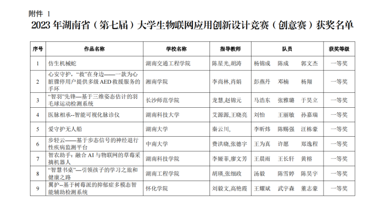 湖南省大学生物联网应用创新设计竞赛是面向大学生的科技创新活动,由湖南省教育厅主办,湖南省物联网学会协办,比赛项目分为创意赛、技能赛和挑战赛。本届比赛来自省内的35所高校183支队伍共500余名参赛选手同台竞技。赛事采用提交作品形式参赛,由专家评委会议评审,直接评出单项奖三等奖作品和入围决赛候选作品,决赛则采用现场演示、答辩的形式,最终决出一等奖和二等奖。