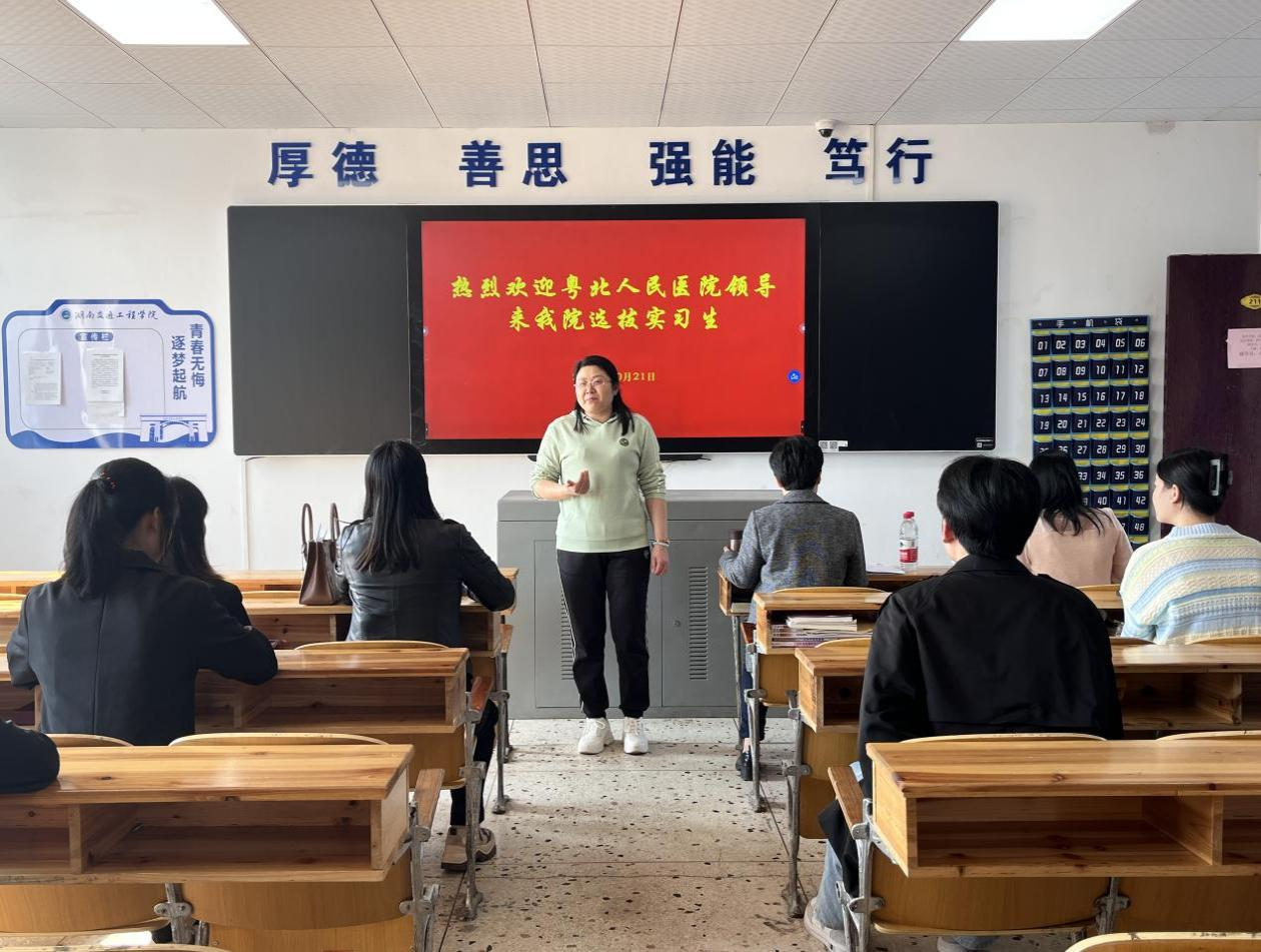 10月21日下午,粤北人民医院在我院教学楼211教室选拔实习生,此次会议由粤北人民医院领导团队、医护学院肖桂香副书记、谭香老师、曾小飞老师、以及我院参加实习选拔的学生共同参与。