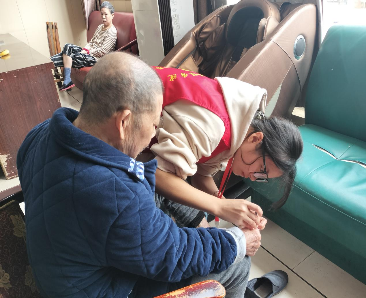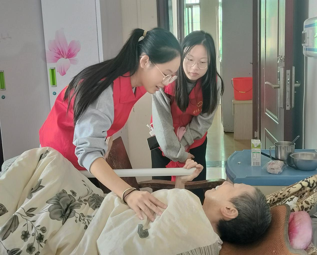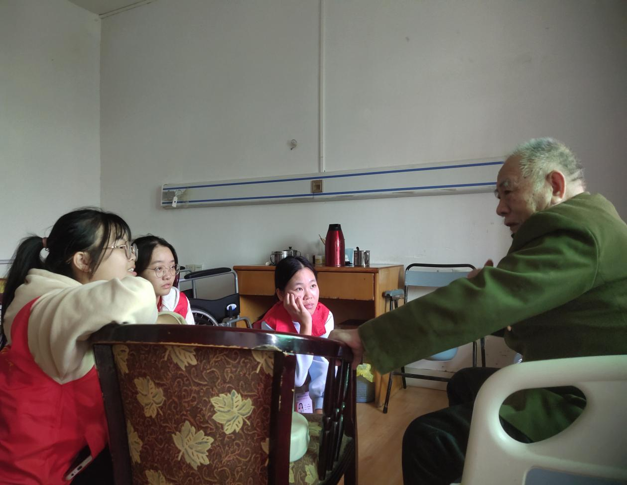 在敬老院,老师和学生们与老人亲切地交谈,向大家宣讲关于养生的知识,同时还老人们修剪指甲、捶背按摩、下象棋、一起唱红歌、跳舞,帮助老人打扫卫生……志愿者们与老人融洽相处真情流露敬老院的老人对志愿者的爱心善举表示感谢,同时也被志愿者的暖心热情深深感动着。