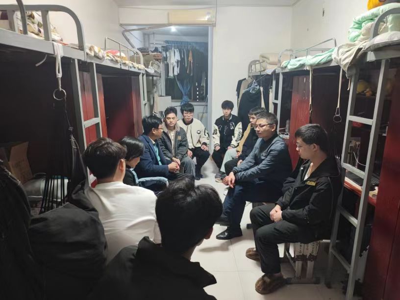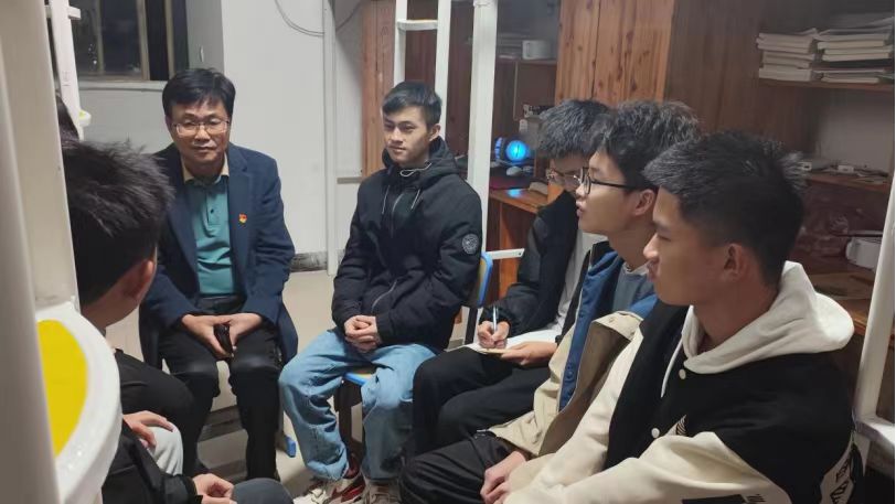 随后,在与九栋学生交谈中,辅导员何立权对学生提出的关于学习、生活和校园安全管理等各方面的问题进行一一解答。何立权老师强调,同学们应加强自我管理,严格落实学校各项规章制度,保持干净整洁的寝室环境,养成健康文明、积极向上的生活习惯,要不断提高校园安全意识,践行“厚德、善思、强能、笃行”的校训,立志做有理想、敢担当、能吃苦、肯奋斗的新时代好青年,也要充分利用在校课余时间开展各类有益身心健康的科研、文体活动,让自己大学生活变得丰富多彩。