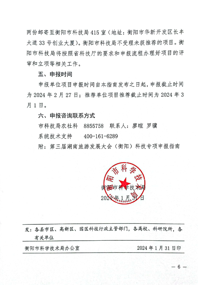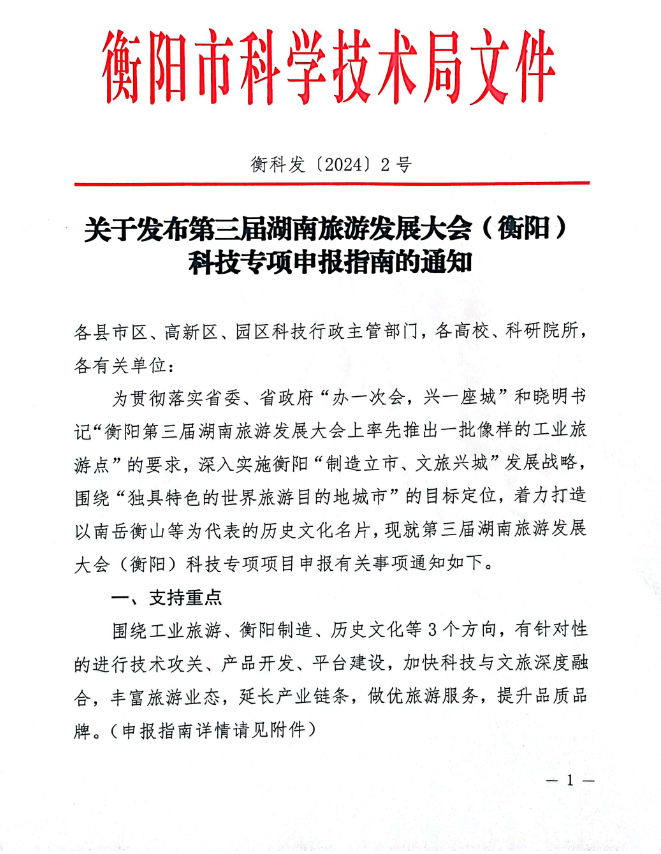 转发:第三届湖南旅游发展大会(衡阳)科技专项申报指南通知 来源: STB 发布时间:2024-02-22 浏览次数:[9912] 次 附件: 第三届湖南旅游发展大会(衡阳)科技专项申报指南通知.pdf 【打印正文】 上一篇: 关于申报2024年“芙蓉计划”——高校优秀思想政治工作者项目的通知 下一篇: 2024年度湖南省教育科学“十四五”规划课题推荐结果公示