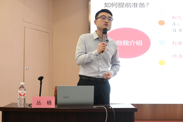 湖南省大学生就业引航计划宣讲团讲师、教育部首批国家级一流课程《演讲与口才》主讲人、湖南省演讲口才学会专家委员会委员丛杨博士以《新思路,心表达——求职面试与态试语言》为题进行开讲。他围绕如果应对面试,从“面试者的仪表、面试者的神情、面试者的体态、面试者的心态”等方面对青年学生作了求职面试指导,同时结合大学生成长规律,对不同年级学生应重点培养和发展的核心能力给出指导性建议。为现场学生带来了一场干货满满的分享,引导青年学子了解企业需求、职业前景和发展定位,掌握面试技巧,以奋斗者姿态主动到基层一线砥砺青春、成就人生。