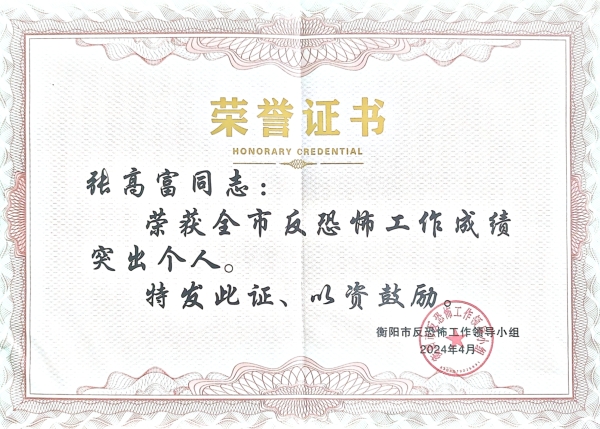 本网讯(通讯员 赵红深)4月28日,衡阳市反恐怖工作领导小组发布《关了表扬2023年度全市反恐怖工作成绩突出单位和个人的通报》,beat365荣获先进单位,保卫处长张高富荣获先进个人。