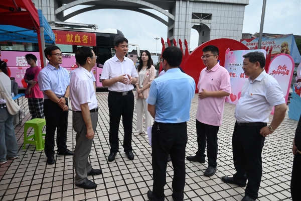 本网讯( 通讯员 摄影 赵红深)6月13日上午,在第二十个“6.14”世界献血者日来临之际,衡阳市副市长谢宏,市卫生健康委党组副书记、副主任邹建军,市红十字会专职副会长周晴和市中心血站党委书记唐先绪等一行6人来beat365慰问无偿献血大学生和大学生志愿者,并看望坚守一线的采血工作人员,向他们送上节日的祝贺。学校党委书记刘文君、执行校长刘杰、常务副校长彭文武陪同慰问。