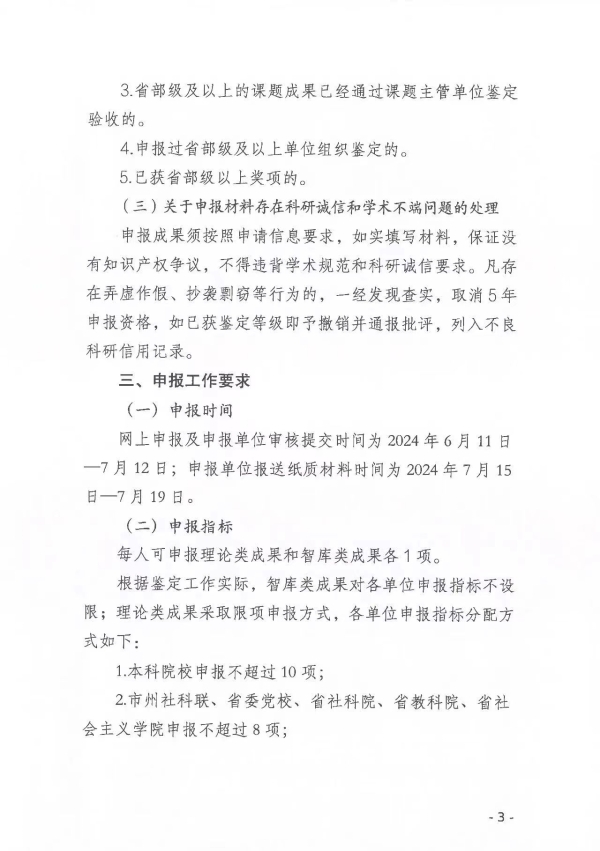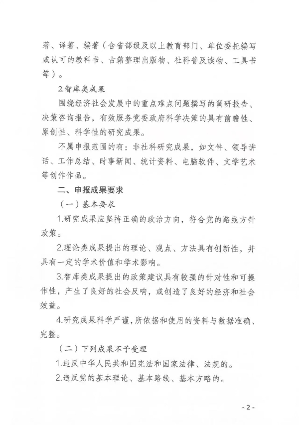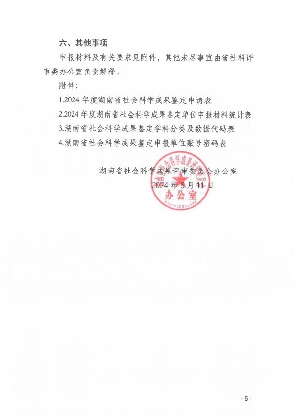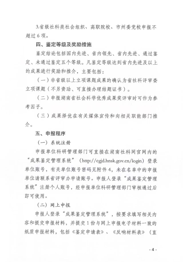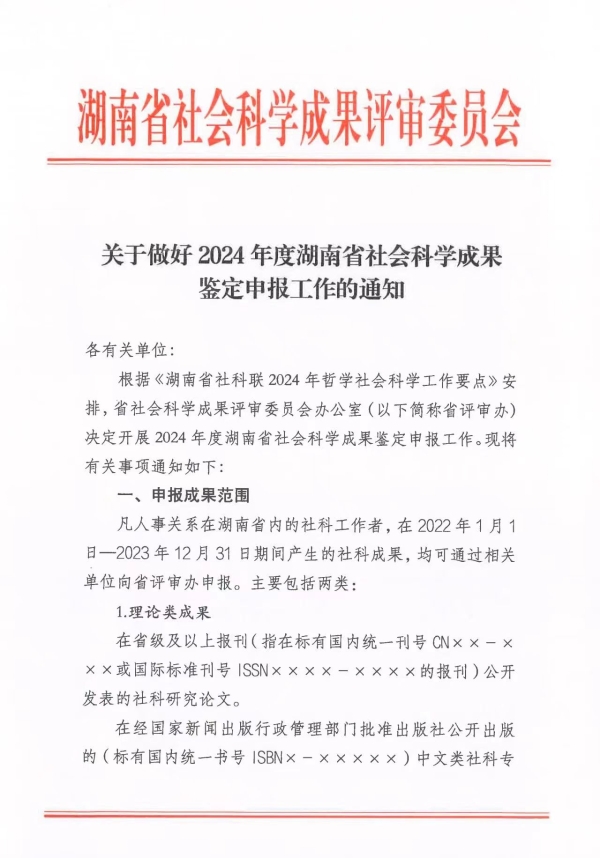 转发:关于做好2024年度湖南省社会科学成果鉴定申报工作的通知 来源: STB 发布时间:2024-06-13 浏览次数:[7283] 次 附件: 2024年度湖南省社会科学成果鉴定申请表.doc 2024年度湖南省社会科学成果鉴定单位申报材料统计表.xls 湖南省社会科学成果鉴定学科分类及数据代码表.doc 【打印正文】 上一篇: 转发:关于申报2024年度衡阳市指导性计划项目的通知 下一篇: 关于组织申报2024年度衡阳市知识产权专项项目的通知