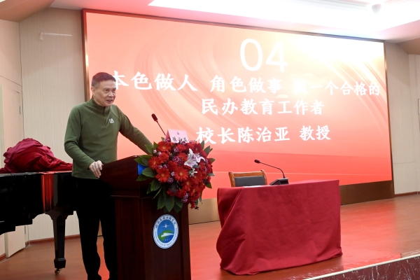 培训班邀请校内外多位专家进行授课。陈治亚以《本色做人,角色做事,做一个合格的民办教育工作者》为主题为培训班作首场专题讲座。讲座围绕“本色做人”“角色做事”“AI赋能”“合格的教育工作者”四个方面系统展开。校长以一个长期从事高等教育工作和高校领导的亲身感悟,阐述了本色做人的重要性和角色做事的原则性。校长的讲话看似简单却富含哲理,通俗易懂却富有智慧,深刻阐明了高校教师修身做人、从教为师、谋事创业的核心要义,是学高为师、身正为范的根本要求,理应成为我们的基本遵循。