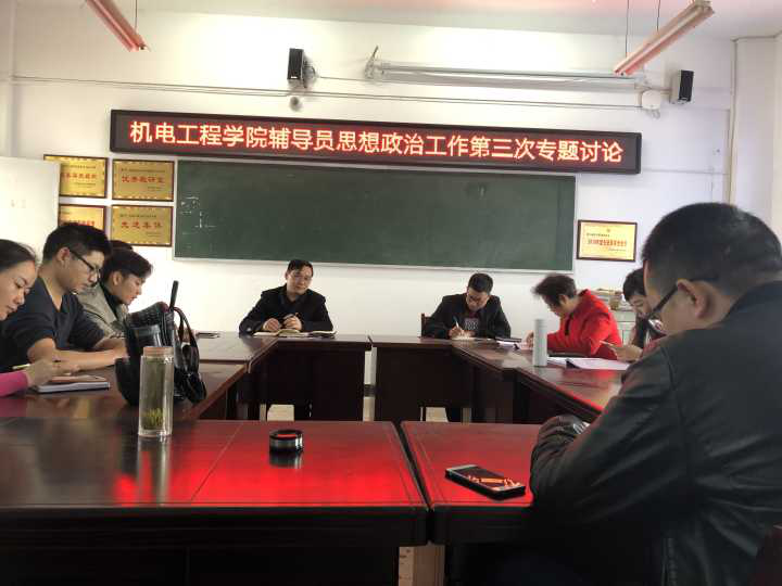 2019年4月2日下午14点50分,机电工程学院全体辅导员在607会议室召开了本学期第三次“思想政治工作专题讨论会”,本次会议由机电工程党总支何美生书记主持。会议旨在围绕如何更好的与学生进行沟通与交流以及创建文明校园展开讨论。
