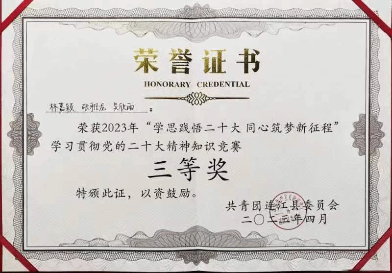 2023年4月25日,由共青团连江县委员会主办,共青团bat365正版唯一官网委员会、共青团福州理工学院委员会承办,bat365正版唯一官网学生协办2023年的“学思践悟二十大,同心筑梦新征程”学习贯彻党的二十大知识竞赛决赛于连江校区明德楼学生活动中心举行。由bat365正版唯一官网20级商务英语3班张雅龙,21级商务英语2班林嘉颖,21级日语1班吴欣雨三位同学组成的bat365正版唯一官网第一代表队在竞赛中沉着冷静、协助作答,最终荣获三等奖的好成绩。