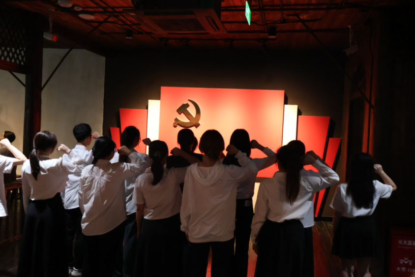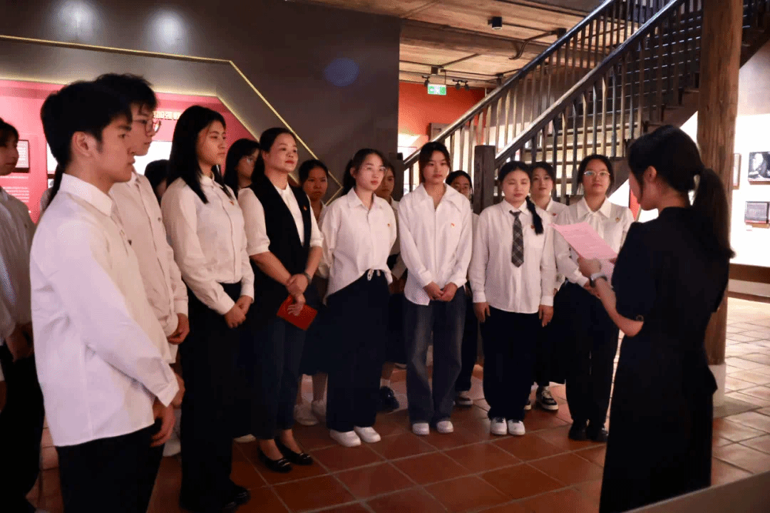 场馆学习之后,全体师生党员在支部书记刘思怡的带领下,在潮江楼二楼的党旗面前重温入党誓词,铮铮誓言回荡在场馆内外,彰显了同志们坚定不移听党话、跟党走的决心。紧接着,刘思怡老师领学了《中国共产党纪律处分条例》,引导教育党员同志们切实增强纪律观念和责任意识;要将党纪处分条例的要求内化于心、外化于行,严格遵守党纪党规,自觉做到知敬畏、存戒惧、守底线;要以身作则,发挥党员的先锋模范作用,营造风清气正的良好氛围。
