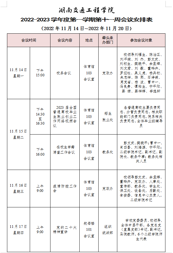 beat365唯一官方网站2022-2023学年度第一学期第十一周会议安排表