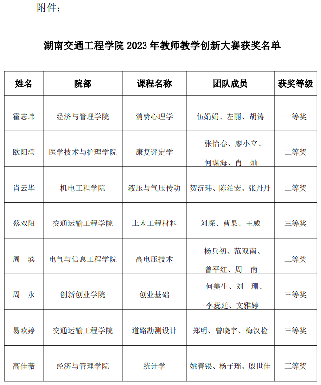 根据湖南省教育厅《关于举办2023年湖南省普通高校教师教学创新大赛的通知》(湘教通[2022]321号)和中国高等教育学会《关于举办第三届全国高校教师教学创新大赛的通知》(高学会[2022]104号)的要求,经教师团队申报、各二级学院(部)初赛,学校决赛,经专家评审,霍志玮团队获一等奖,欧阳滢等2个团队获二等奖,蔡双阳等5个团队获三等奖(详见附件)。