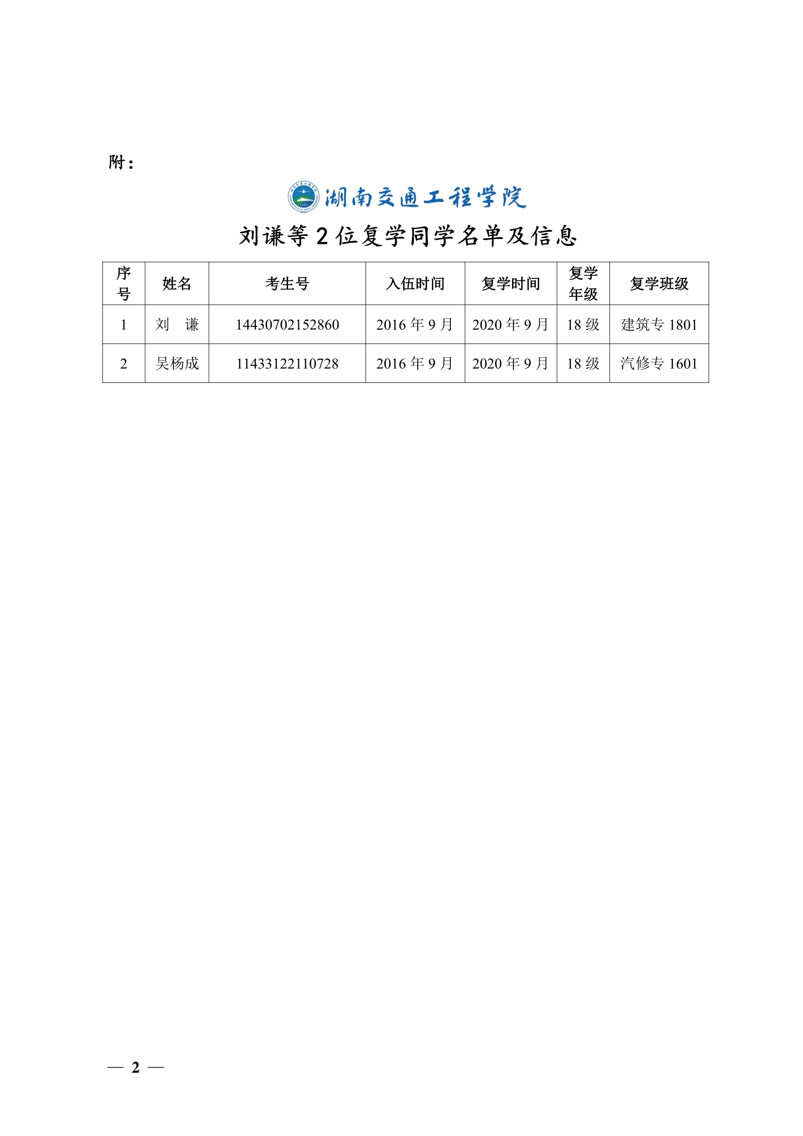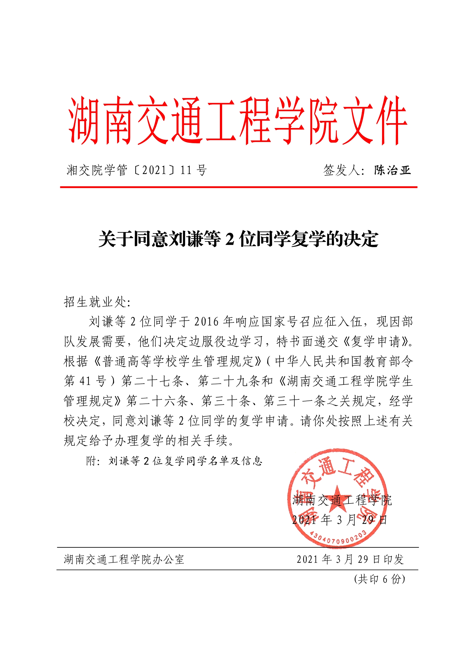 关于同意刘谦等2位同学复学的决定(湘交院学管〔2021〕11号)