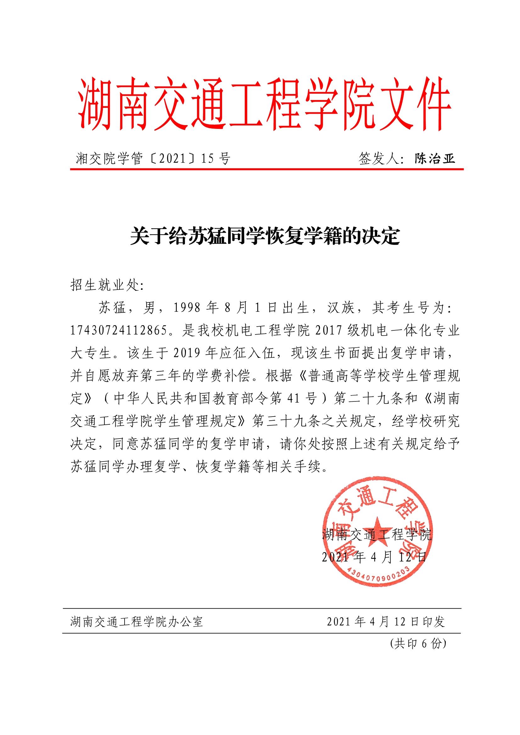 关于给苏猛同学恢复学籍的决定(湘交院学管〔2021〕15号)