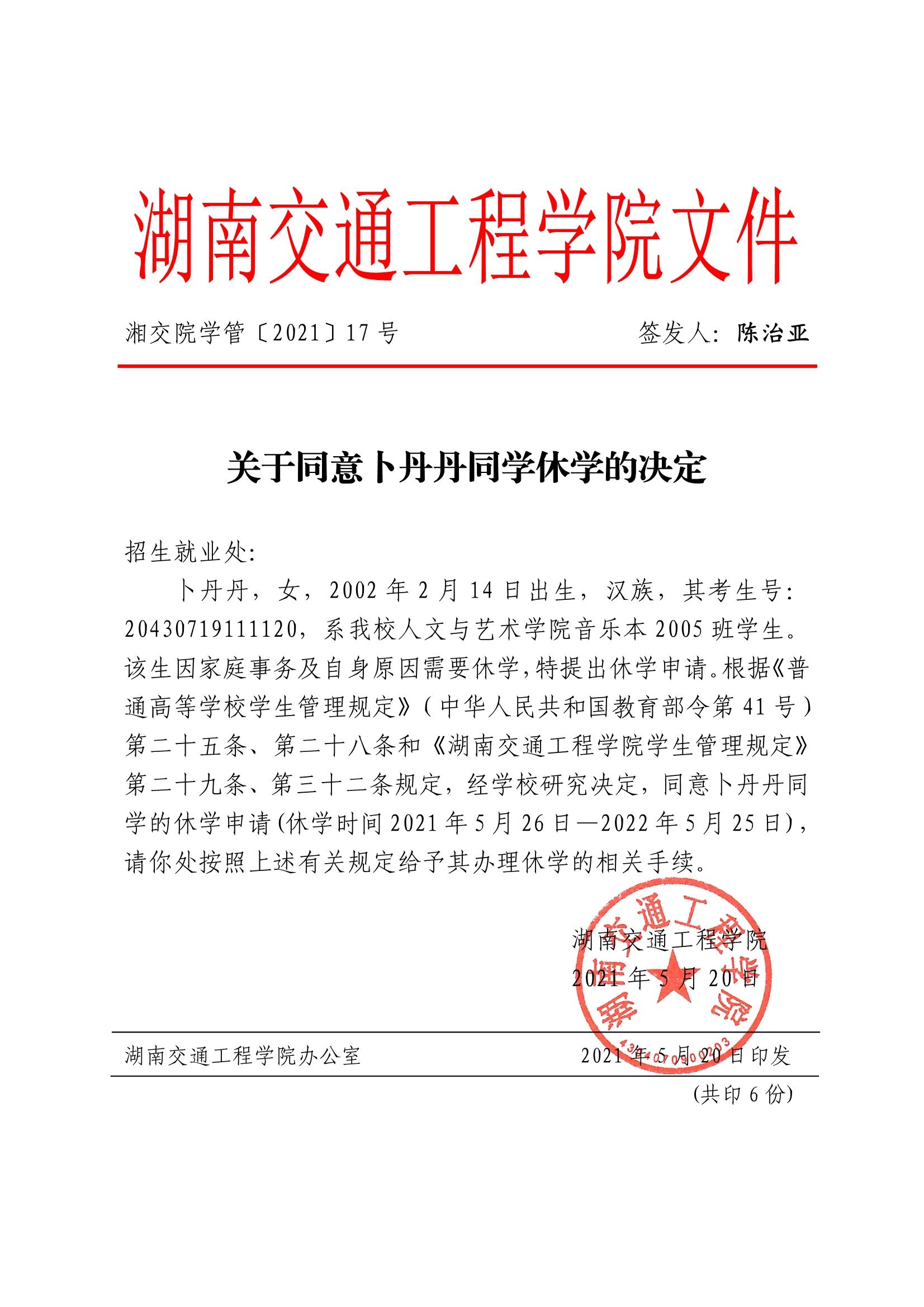 关于同意卜丹丹同学休学的决定(湘交院学管〔2021〕17号)