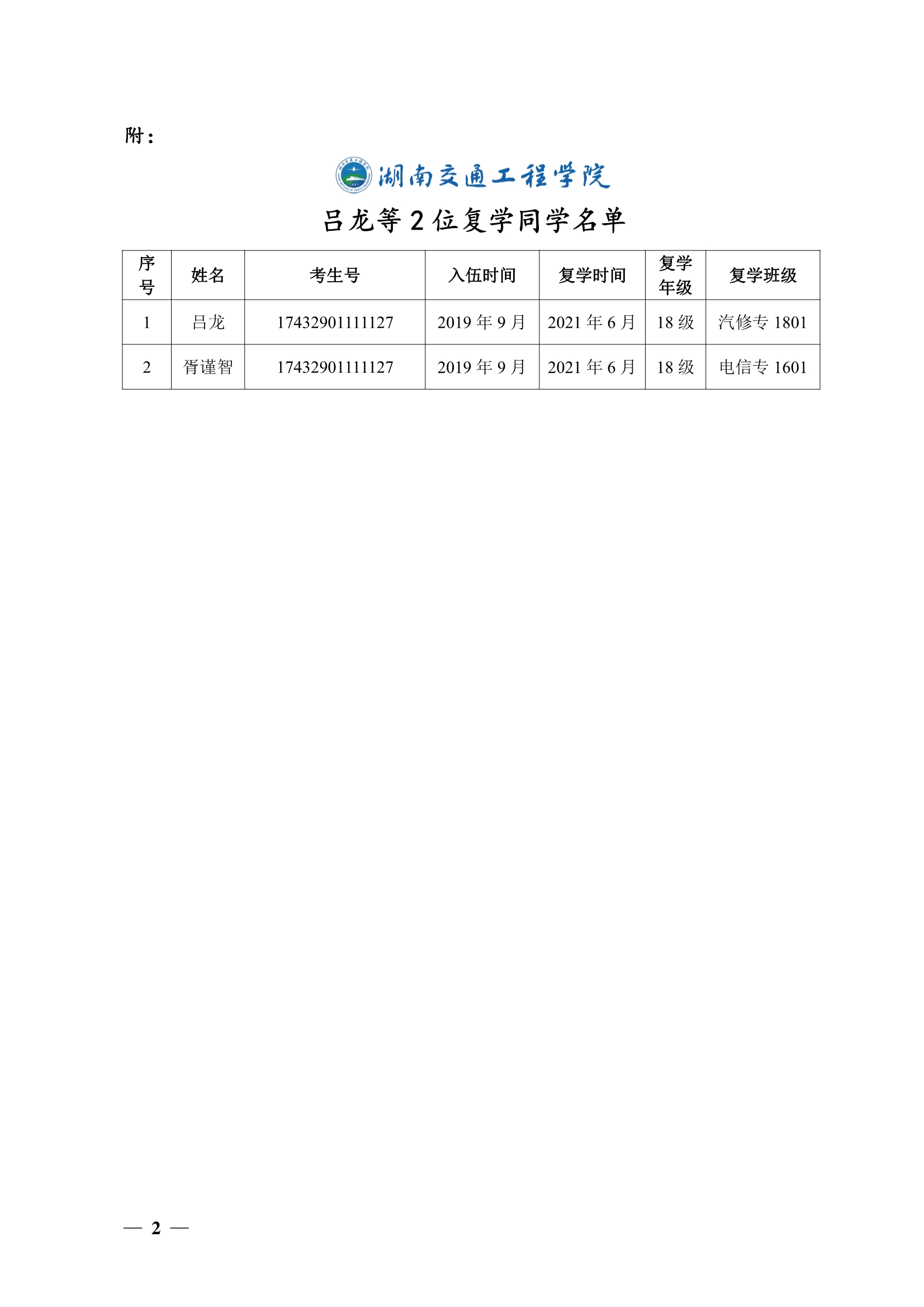 关于同意吕龙等2位同学复学的决定(湘交院学管〔2021〕21号)
