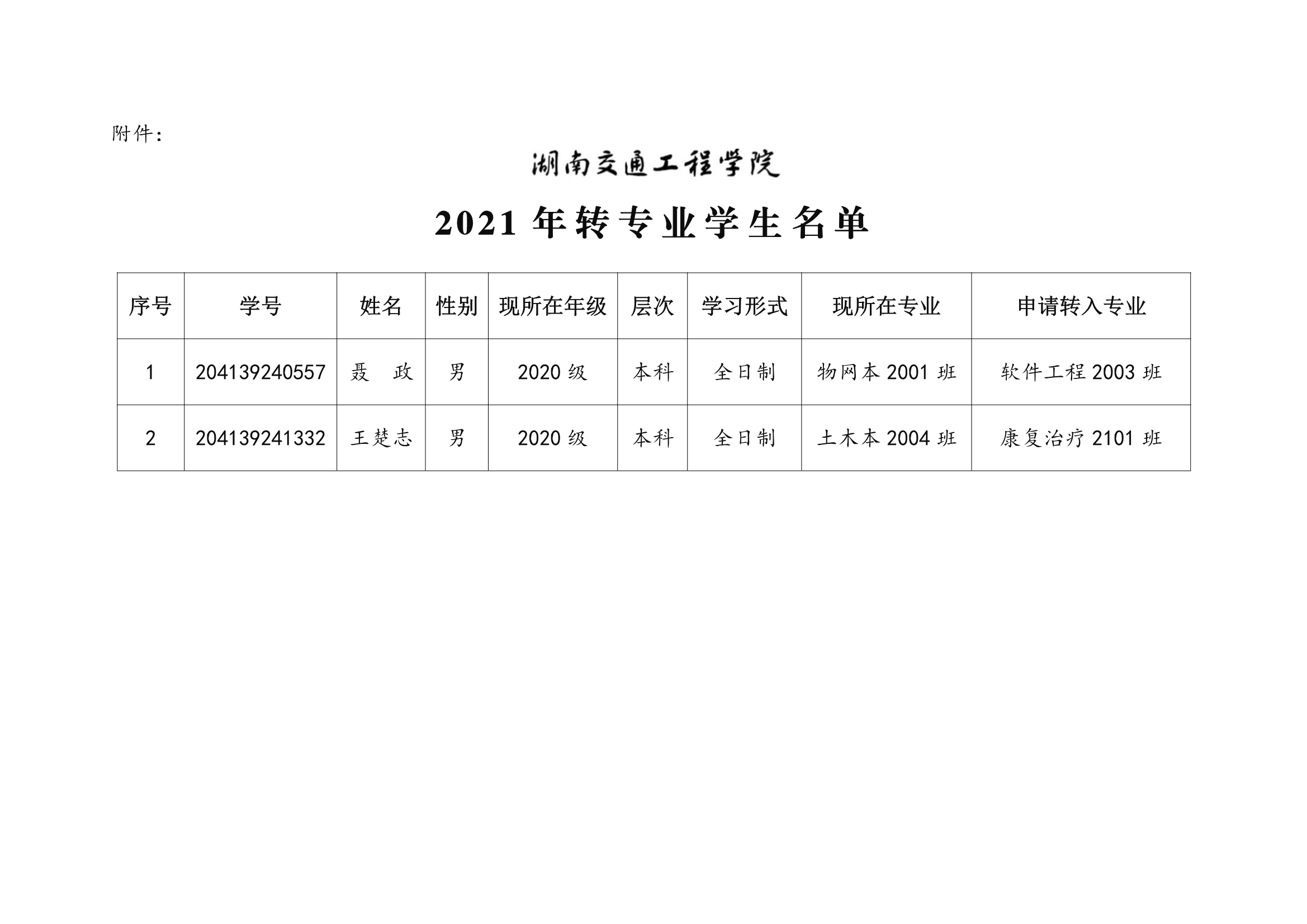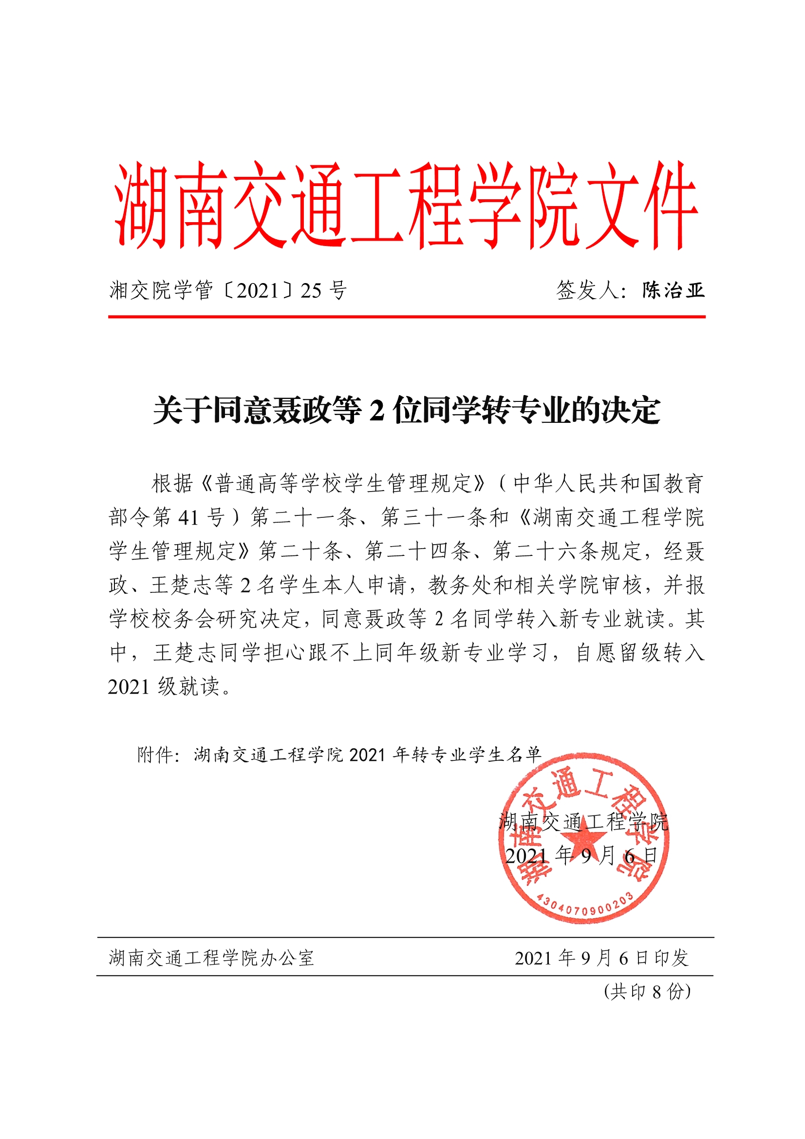 关于同意聂政等2位同学转专业的决定(湘交院学管〔2021〕25号)