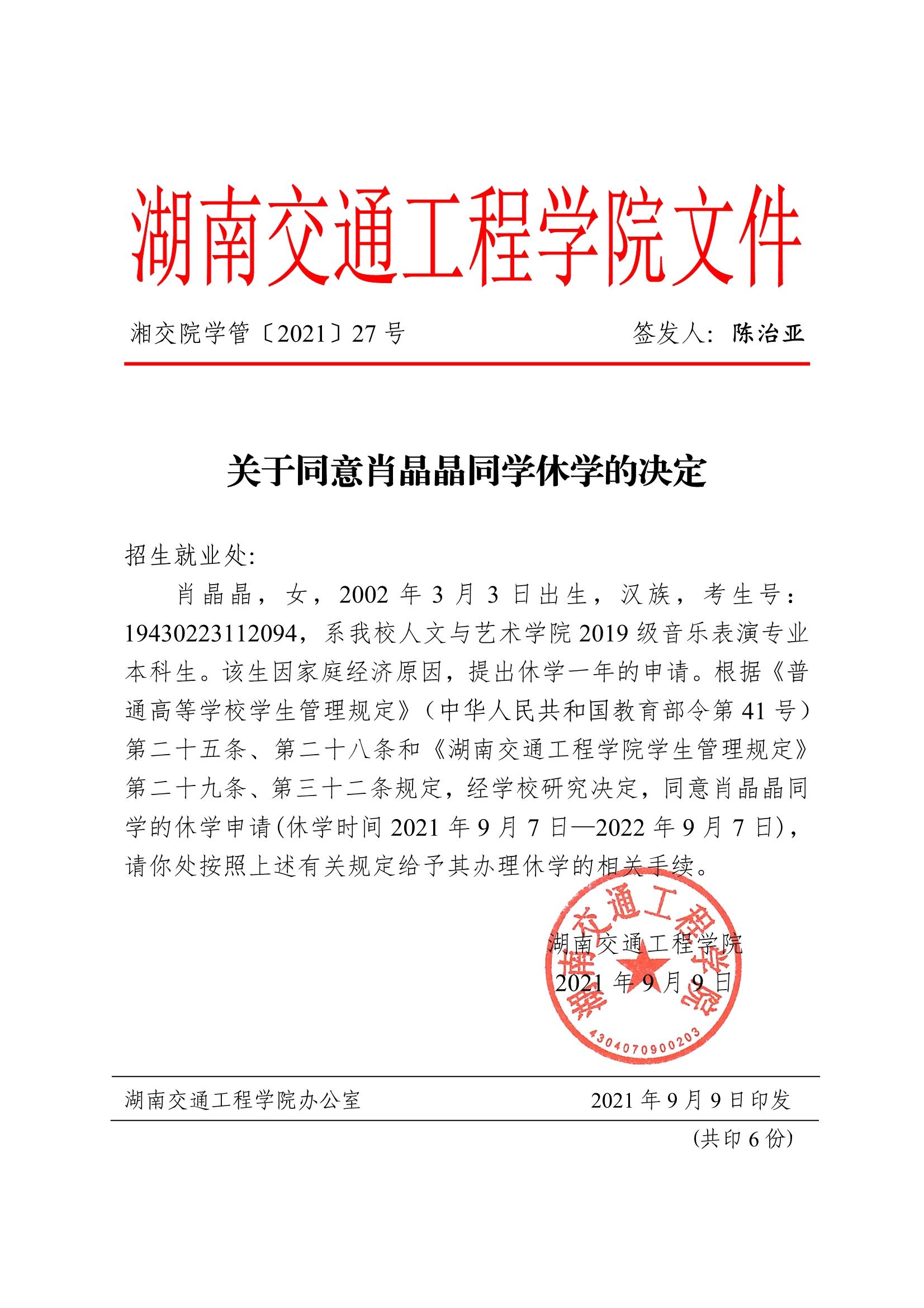 关于同意肖晶晶同学休学的决定(湘交院学管〔2021〕27号)