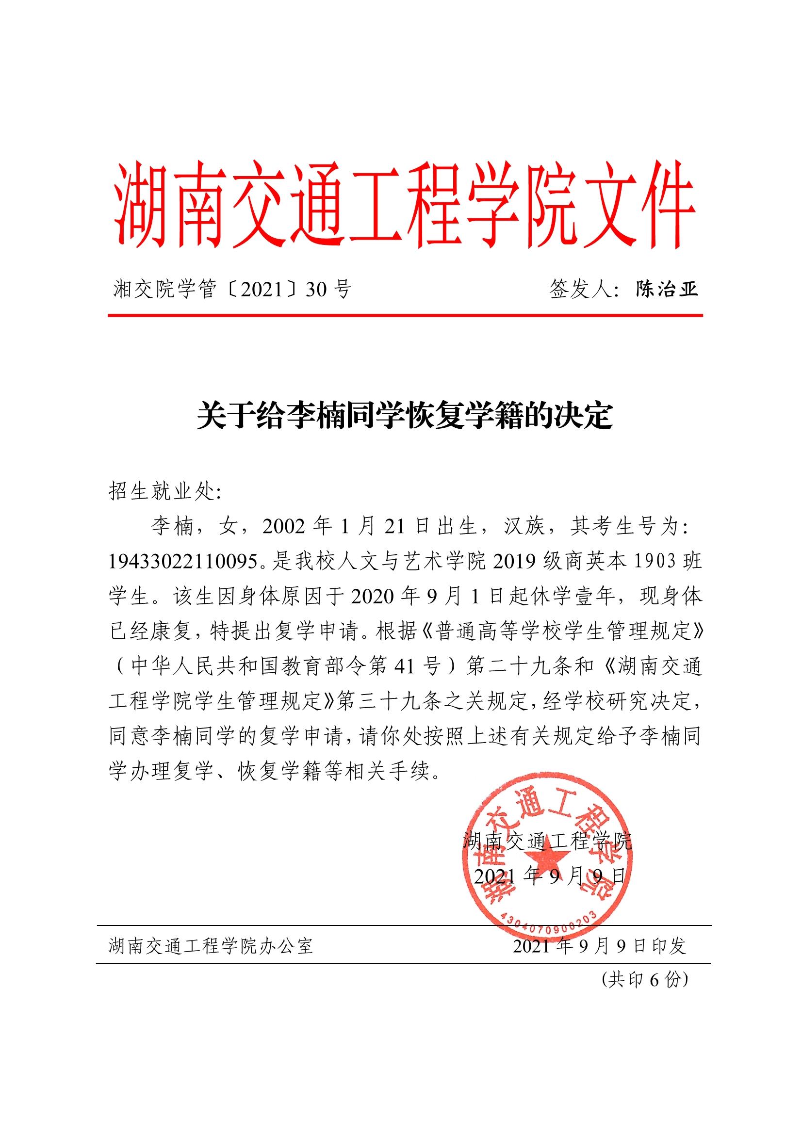 关于给李楠同学恢复学籍的决定(湘交院学管〔2021〕30号)