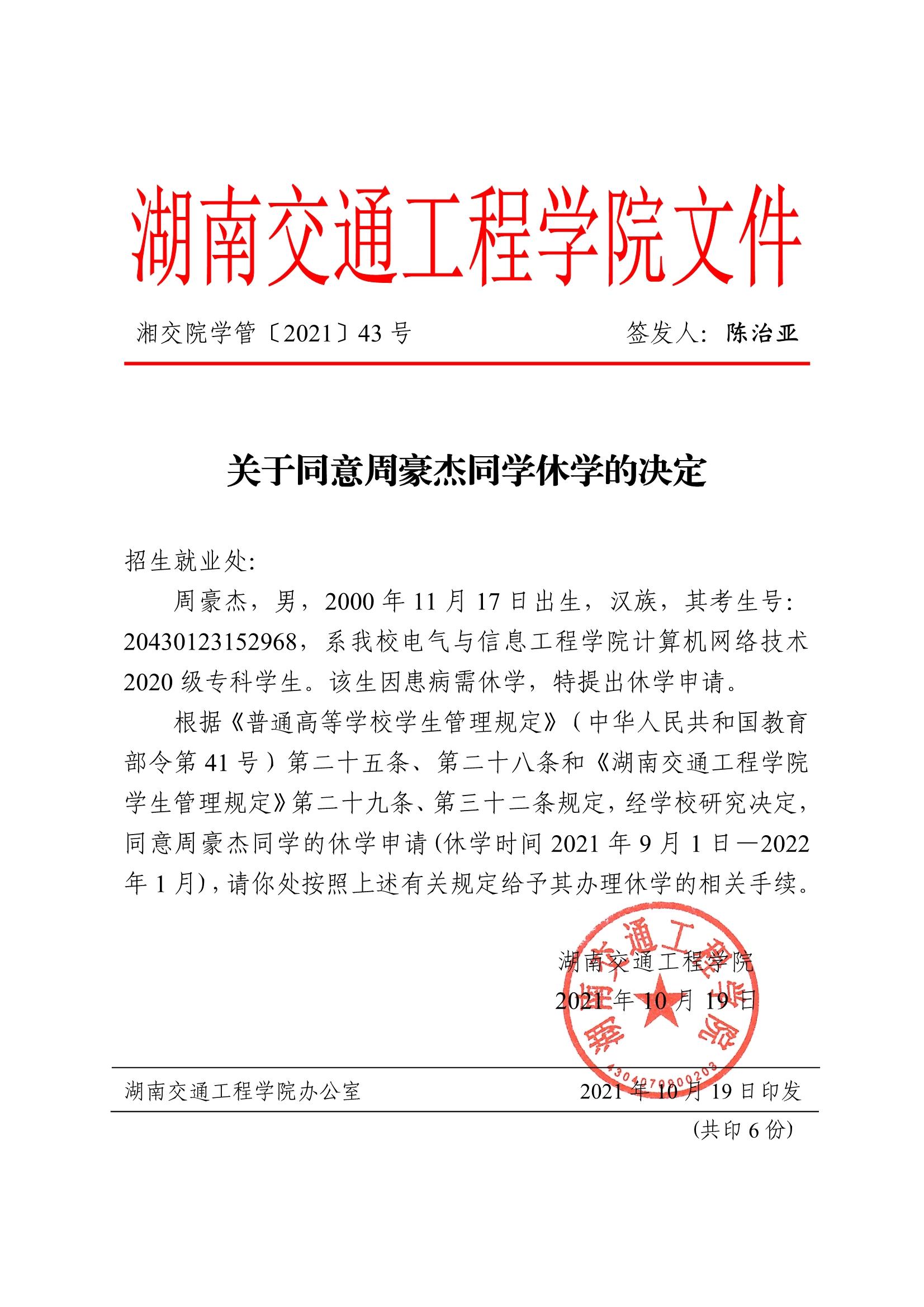 关于同意周豪杰同学休学的决定(湘交院学管〔2021〕43号)