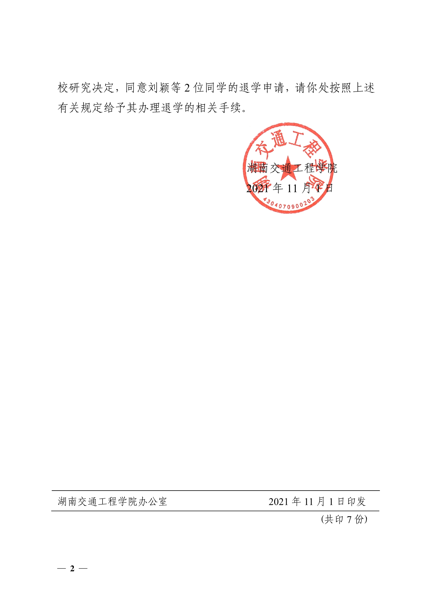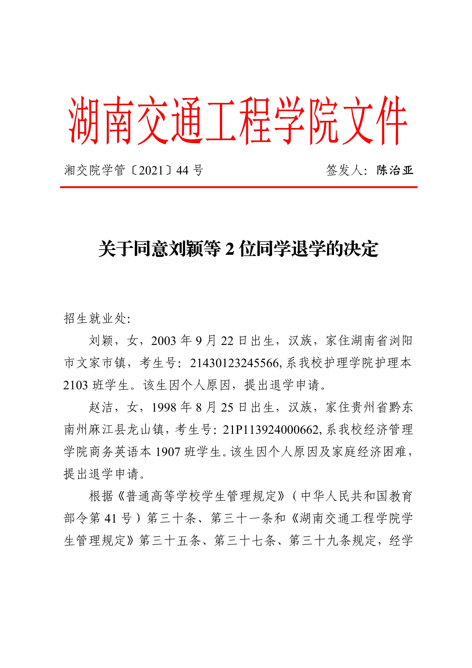 关于同意刘颖等2位同学退学的决定(湘交院学管〔2021〕44号)