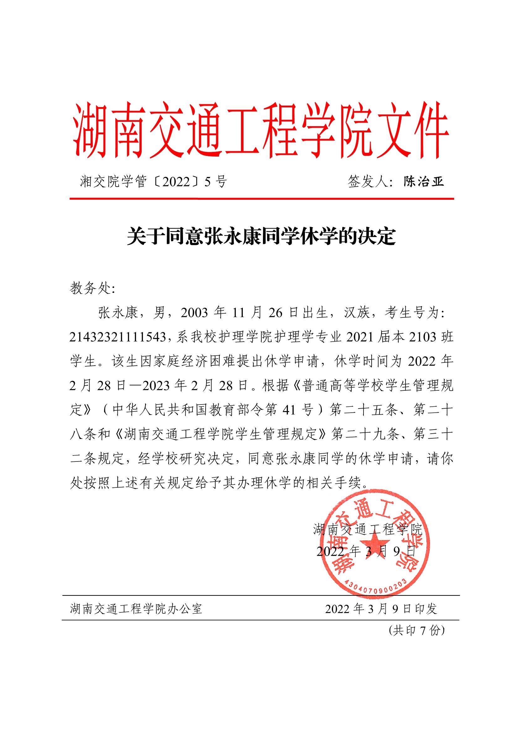 关于同意张永康同学休学的决定(湘交院学管〔2022〕5号)