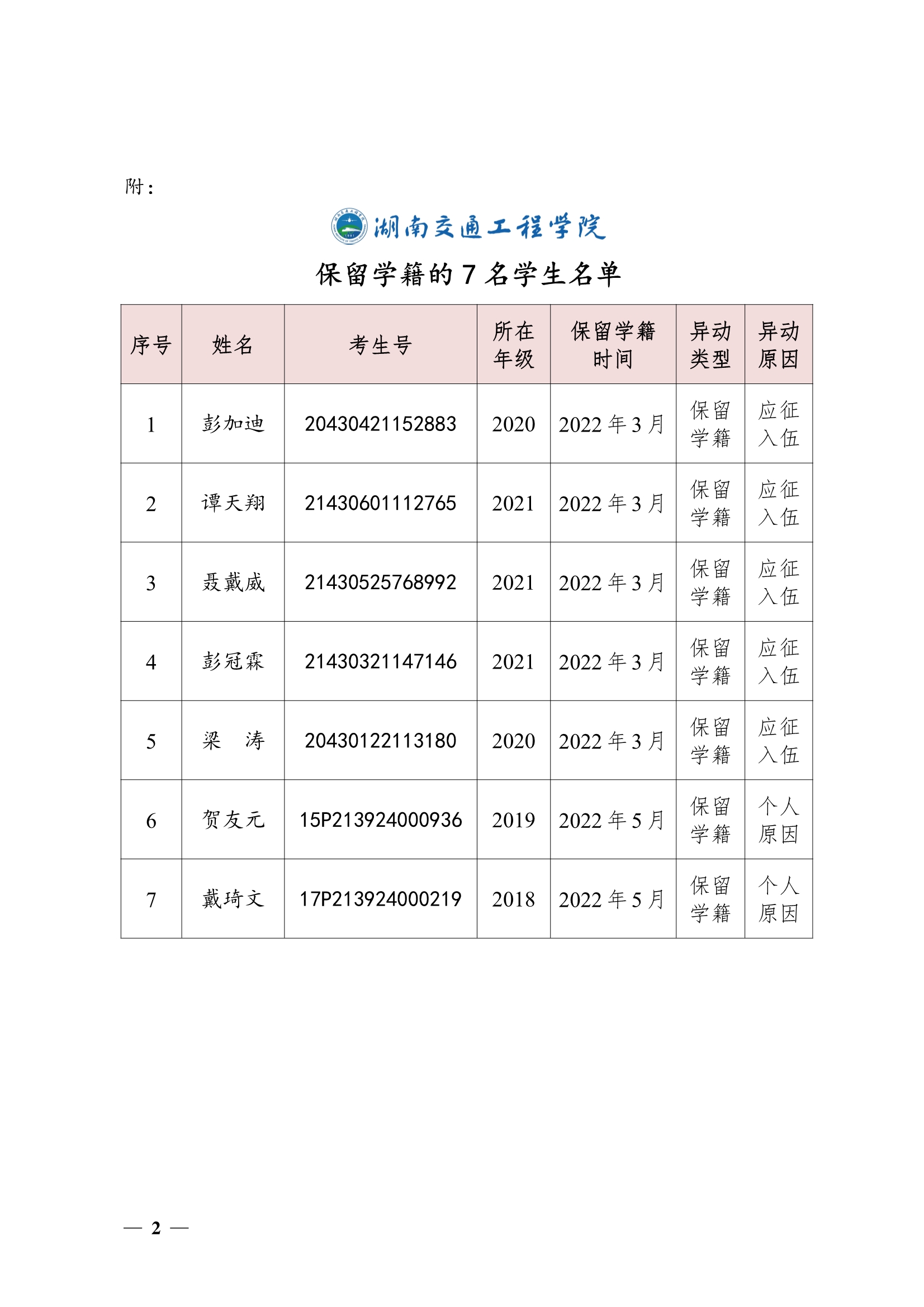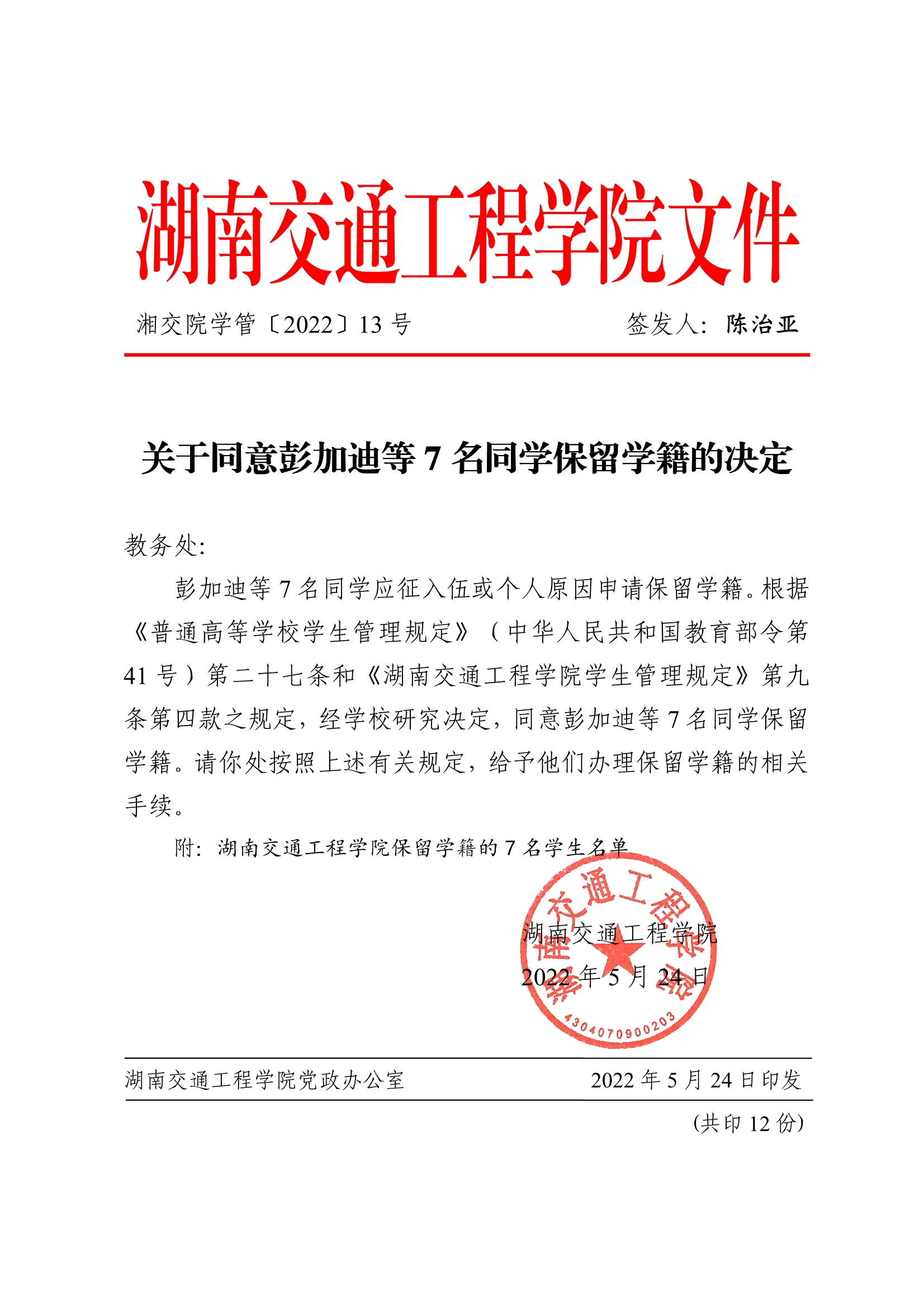 关于同意彭加迪等7名同学保留学籍的决定(湘交院学管〔2022〕13号)