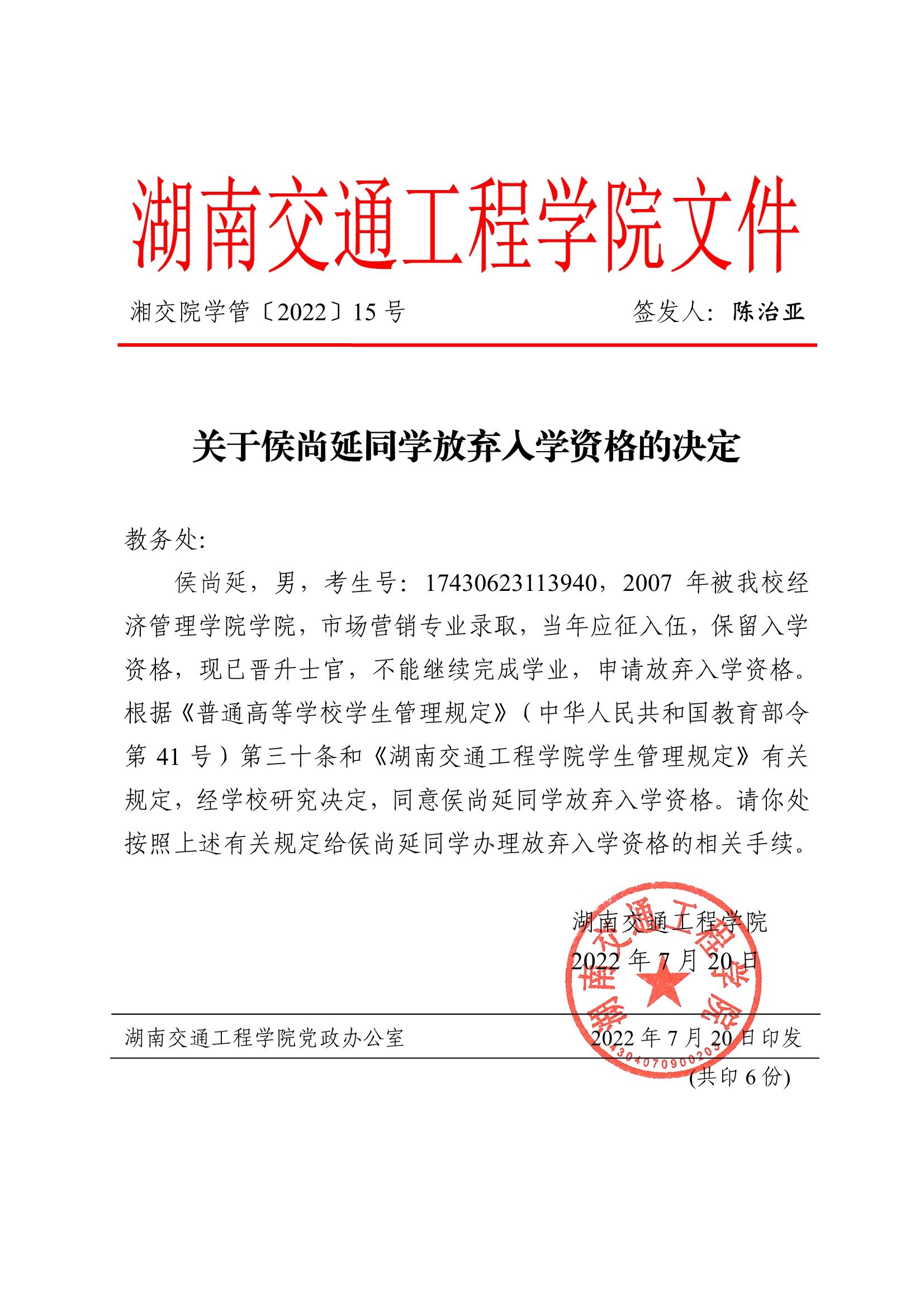 关于侯尚延同学放弃入学资格的决定(湘交院学管〔2022〕15号)