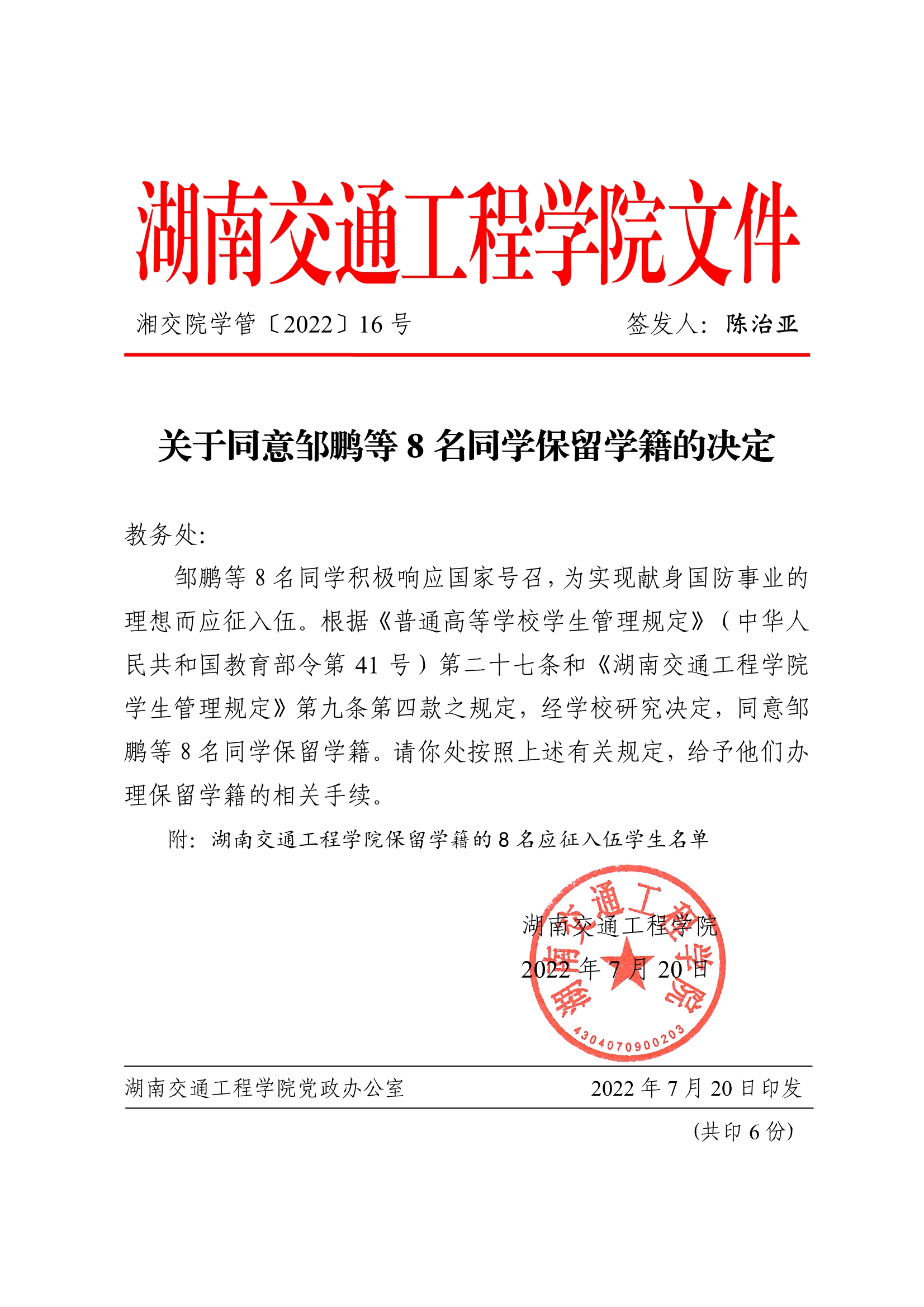 关于同意邹鹏等8名同学保留学籍的决定(湘交院学管〔2022〕16号)