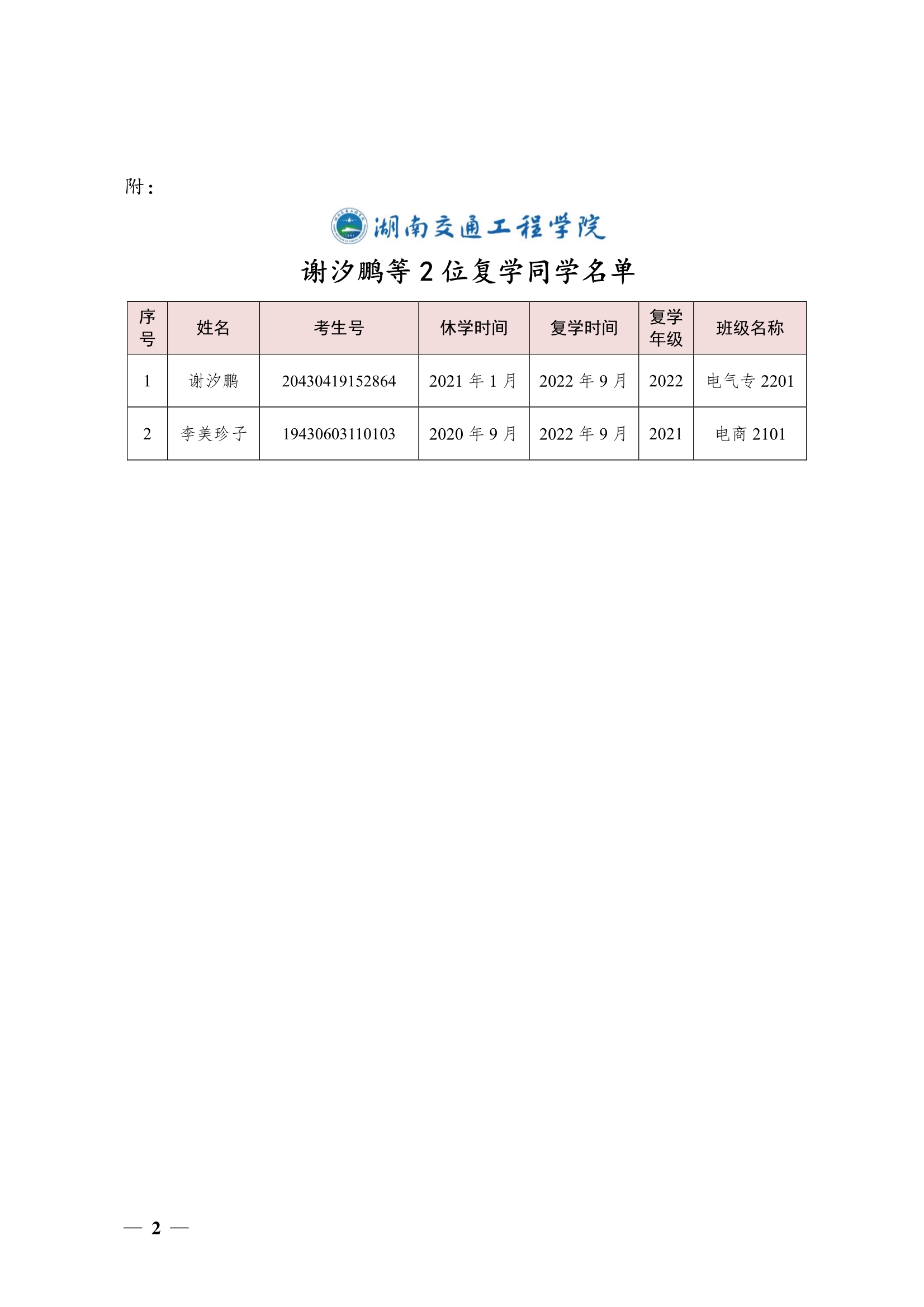 关于同意谢汐鹏等2位同学复学的决定(湘交院学管〔2022〕28号)