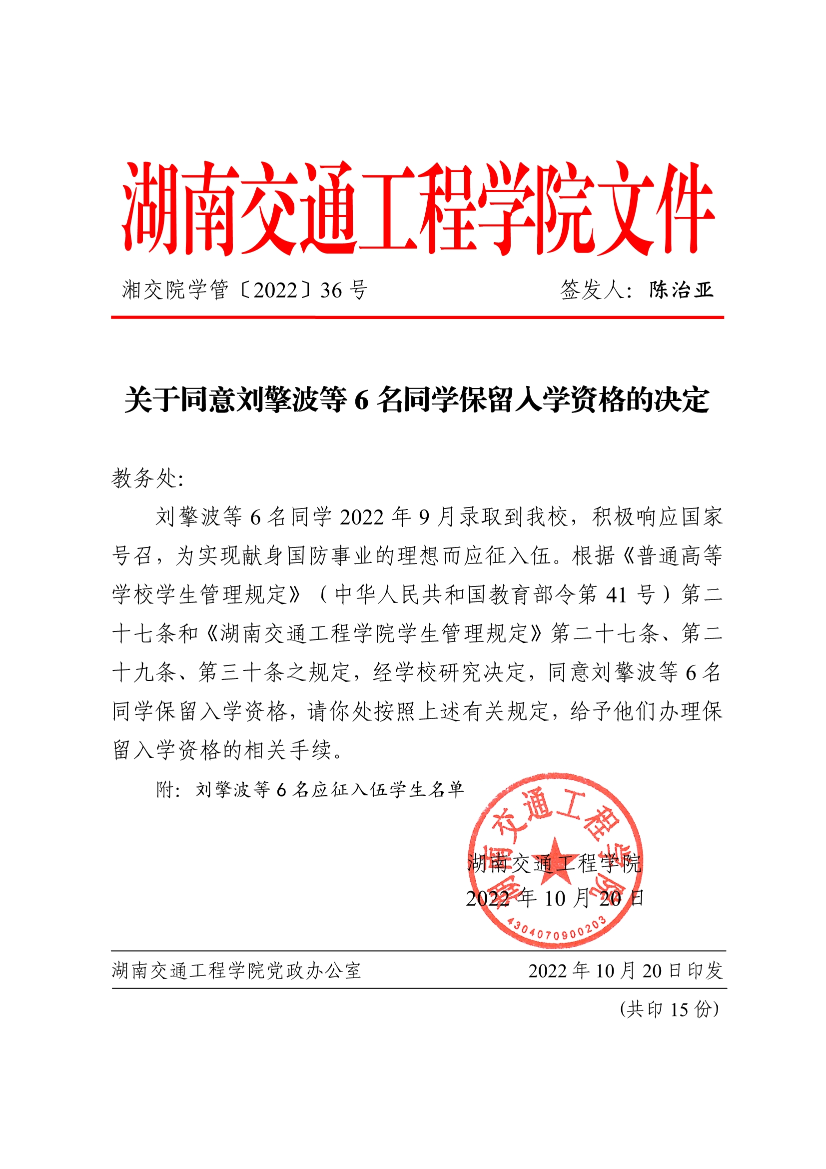 关于同意刘擎波等6名同学保留入学资格的决定(湘交院学管〔2022〕36号)