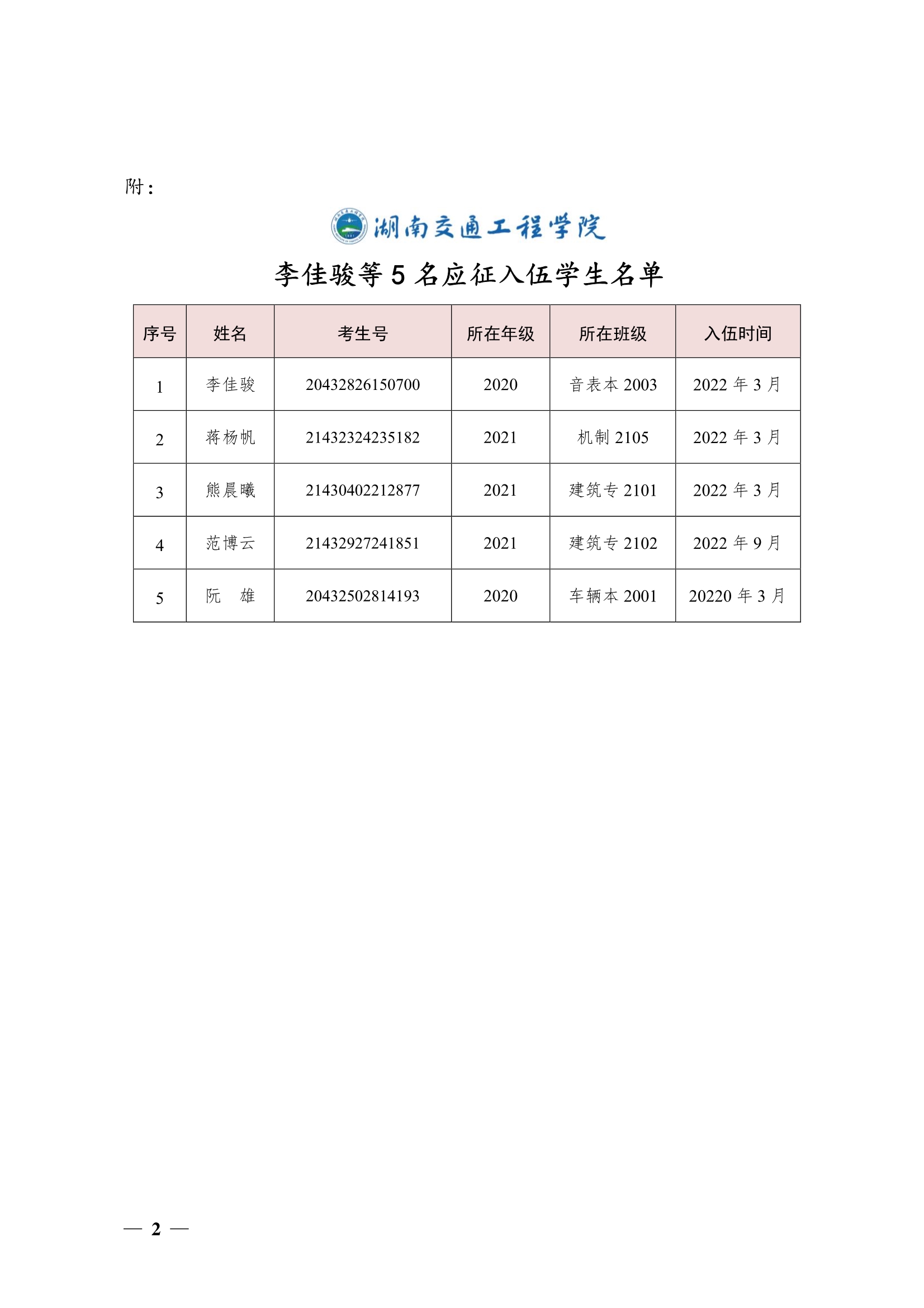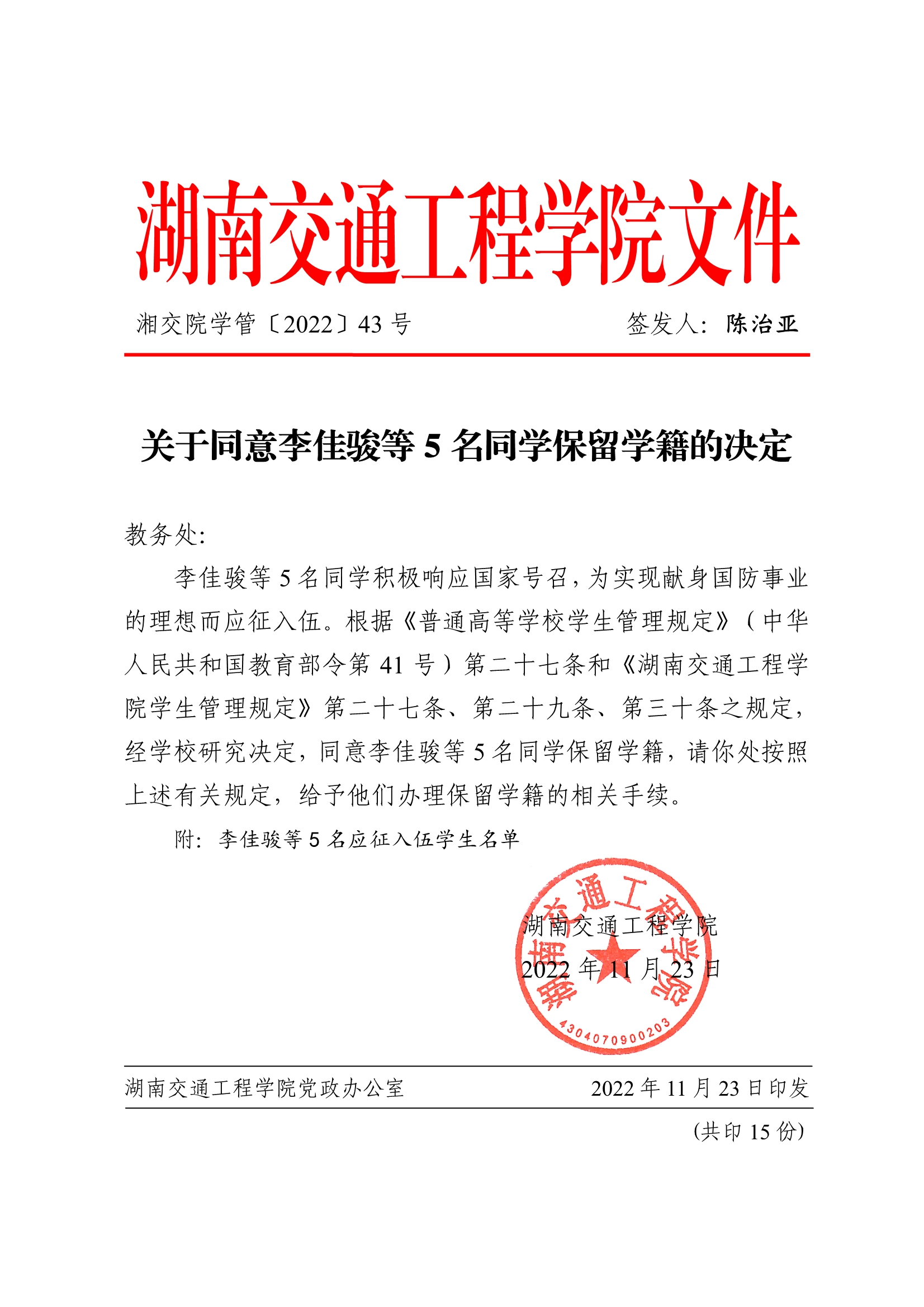 关于同意李佳骏等5名同学保留学籍的决定(湘交院学管〔2022〕43号)