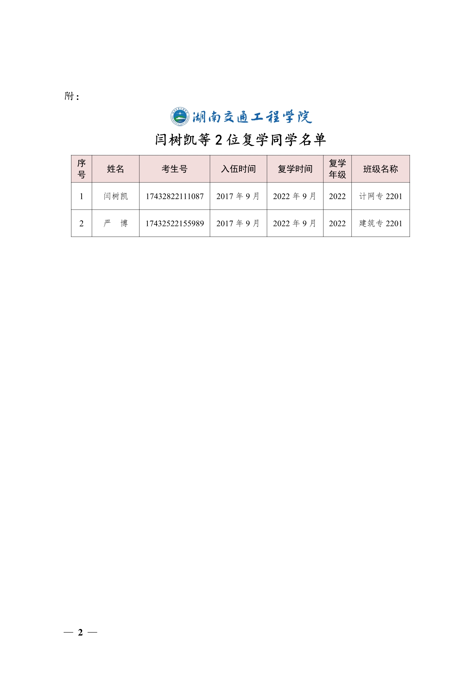 关于同意闫树凯等2位同学复学的决定(湘交院学管〔2022〕45号)