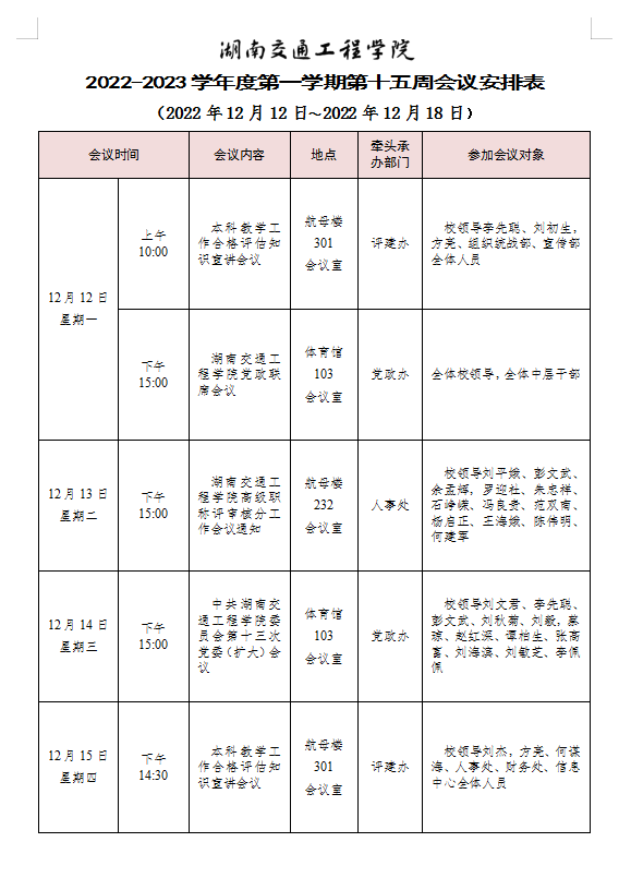 beat365唯一官方网站 2022-2023学年度第一学期第十五周会议安排表