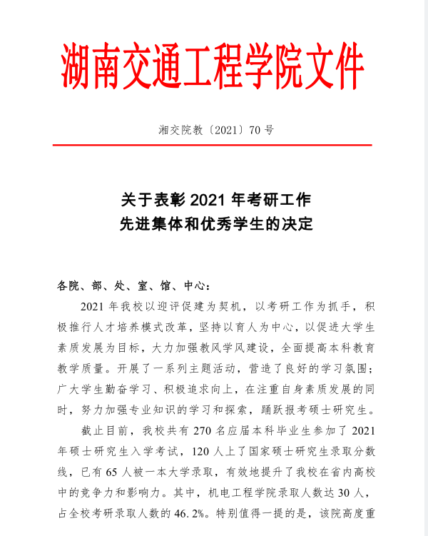 湘交院教〔2021〕70号 关于表彰2021年考研工作先进集体和先进个人的决定.pdf