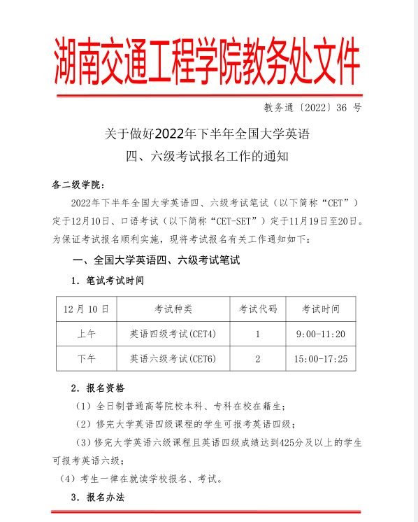 关于做好2022年下半年全国大学英语 四、六级考试报名工作的通知