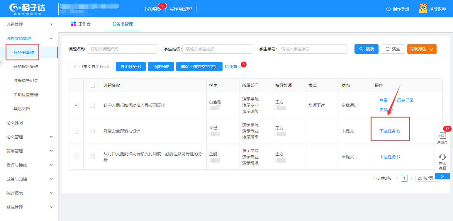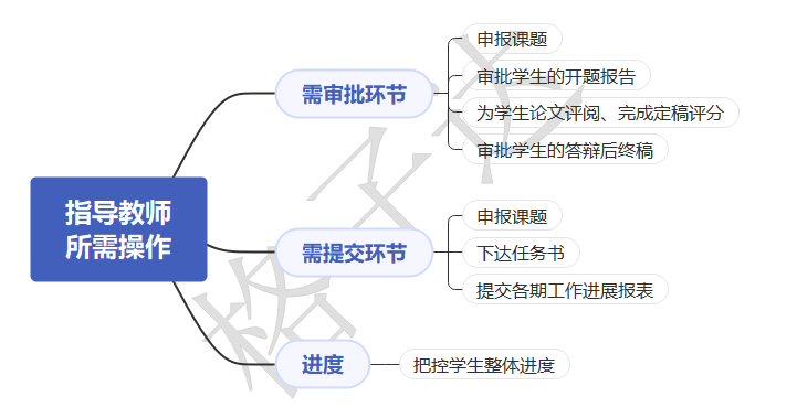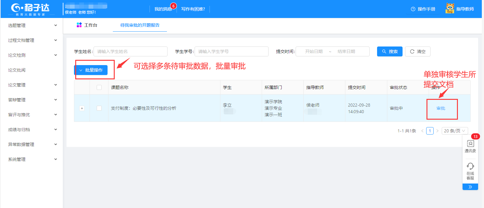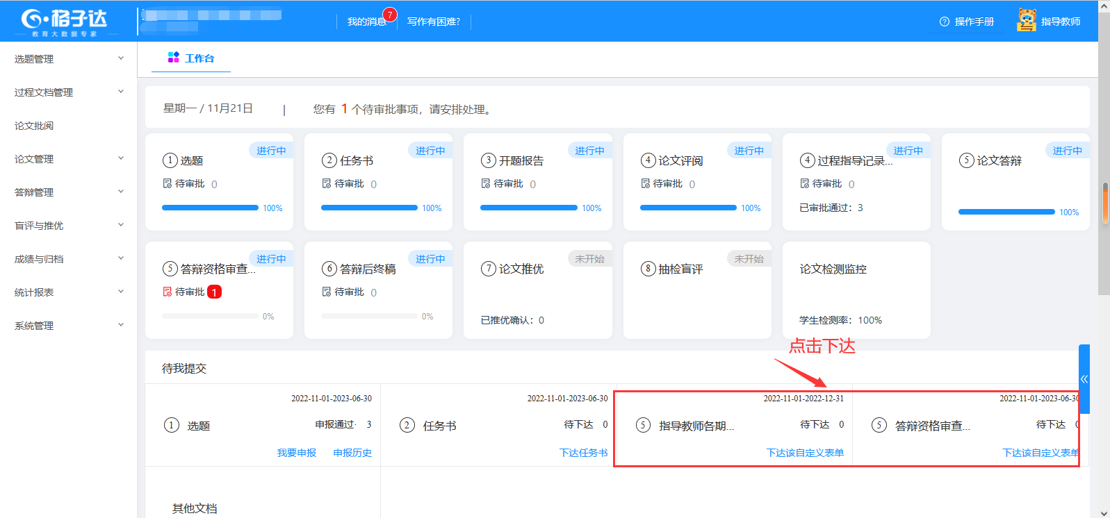 导师进入工作台,查看与审批学生提交的课题、开题报告、论文等。