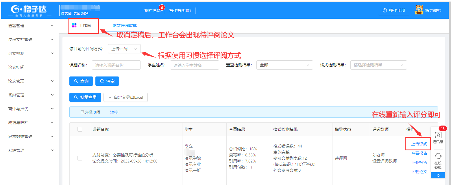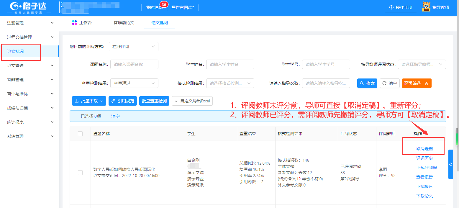 如评阅教师已评分,由评阅教师先撤回评分。