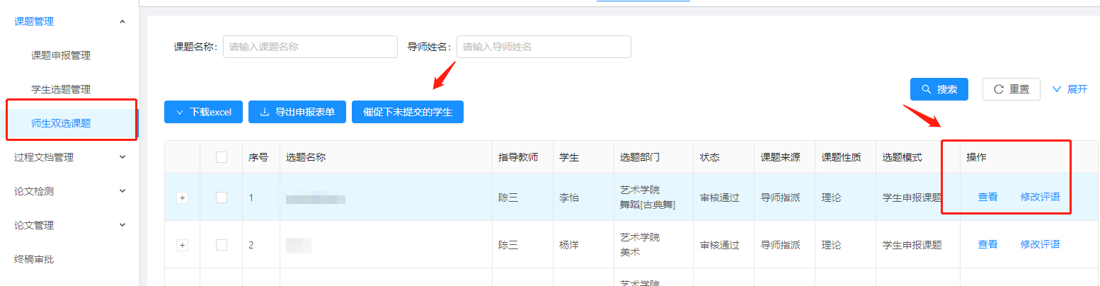2.师生双选课题:展示所有已经跟通过课题关联好的学生和老师。