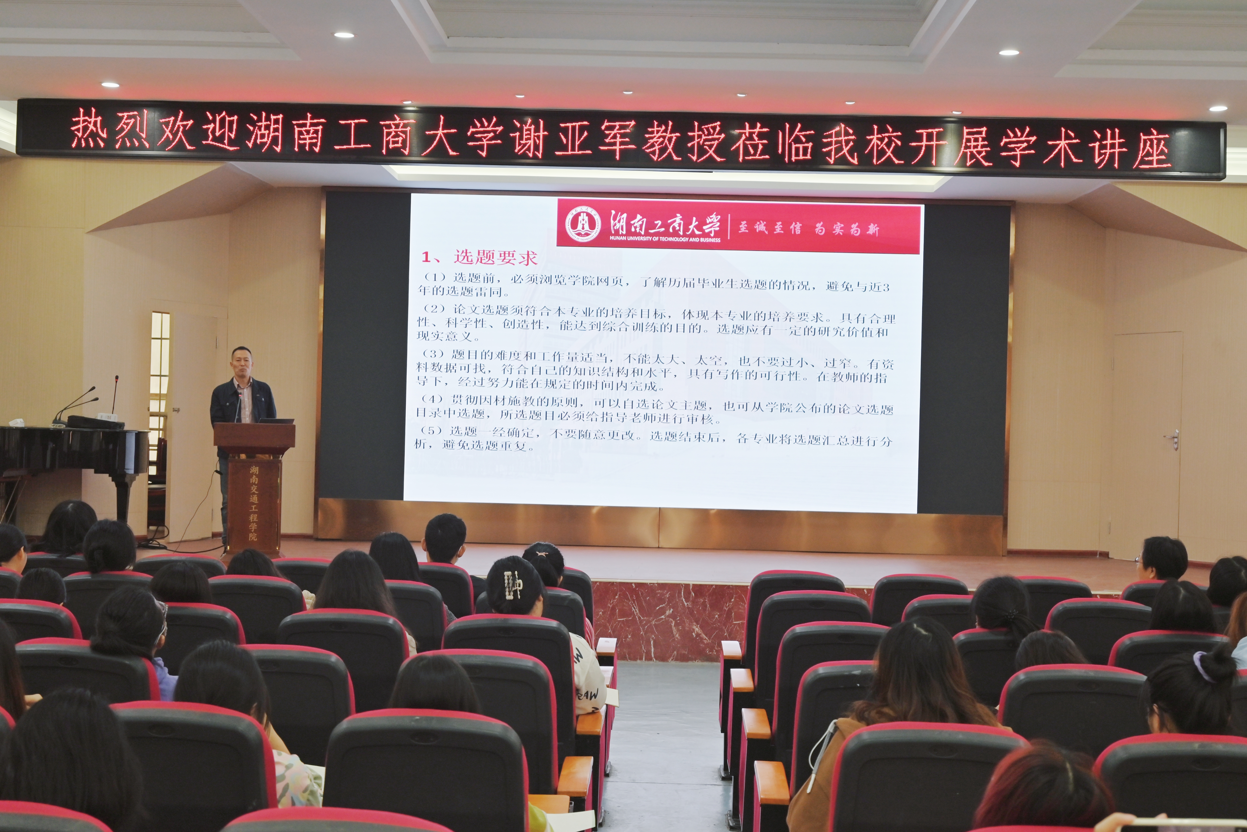 本网讯(通讯员  赵红深  王芳  摄影  赵红深 )107日上午,湖南工商大学国际商学院副院长、硕士生导师谢亚军教授应邀来beat365讲学,指导英语专业学生学习和毕业论文。上午9-10时,在航母楼101会议室为beat36519级学生作了题为“如何撰写英语类本科毕业论文”学术报告;1030-1130,谢教授不辞辛苦,接着与beat3652022级新生分享了“大学生涯设计与学习方法”。人文与艺术学院党总支书记刘敏芝、副院长刘彪出席报告会,两场报告先后近800英语专业学生到会聆听,刘彪主持。