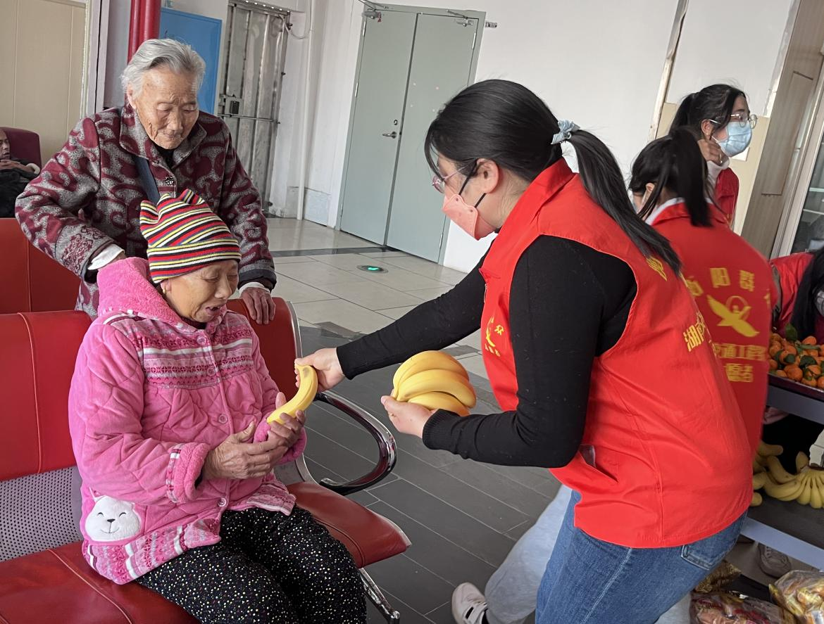 在敬老院,教工党支部和青年志愿者们分别行动做志愿者服务,他们先为老人们挨个亲手送上水果和食品,并且教职工老师们为老人讲解生活中常用的健康保健知识。另一部分学生志愿者则陪同老人下棋、室外锻炼,搀扶老人散步,推着轮椅陪护老人在室外逛逛小组内还出现学姐带学妹的架势,有来过2回的王小嫚同学说:“像这种手脚已经不利索的老人家,起不来身,你们可以帮她把香蕉皮剥了,侧坐着扶起喂她吃”,作为医护学院的同学,有这份仁爱的精神和专业素养是非常值得传承,让大一的新生看在眼里,记在心里。老人们原本无表情的脸上都展露了笑颜,老人孤寂的心在同学们火热的心得带动下逐渐温暖,这一大一小,一老一少碰撞出不同的火花和温情。