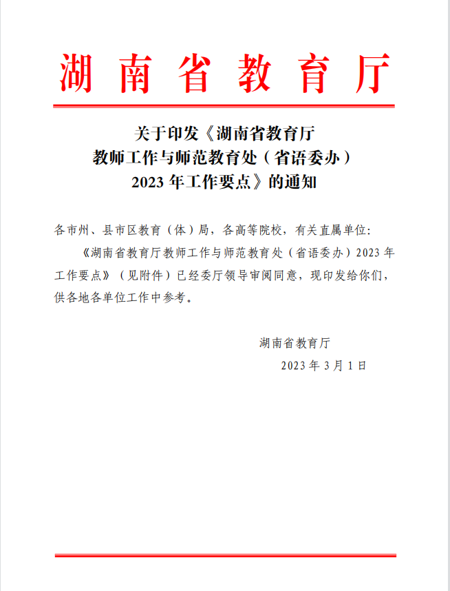 (转)关于印发《湖南省教育厅 教师工作与师范教育处(省语委办) 2023 年工作要点》的通知