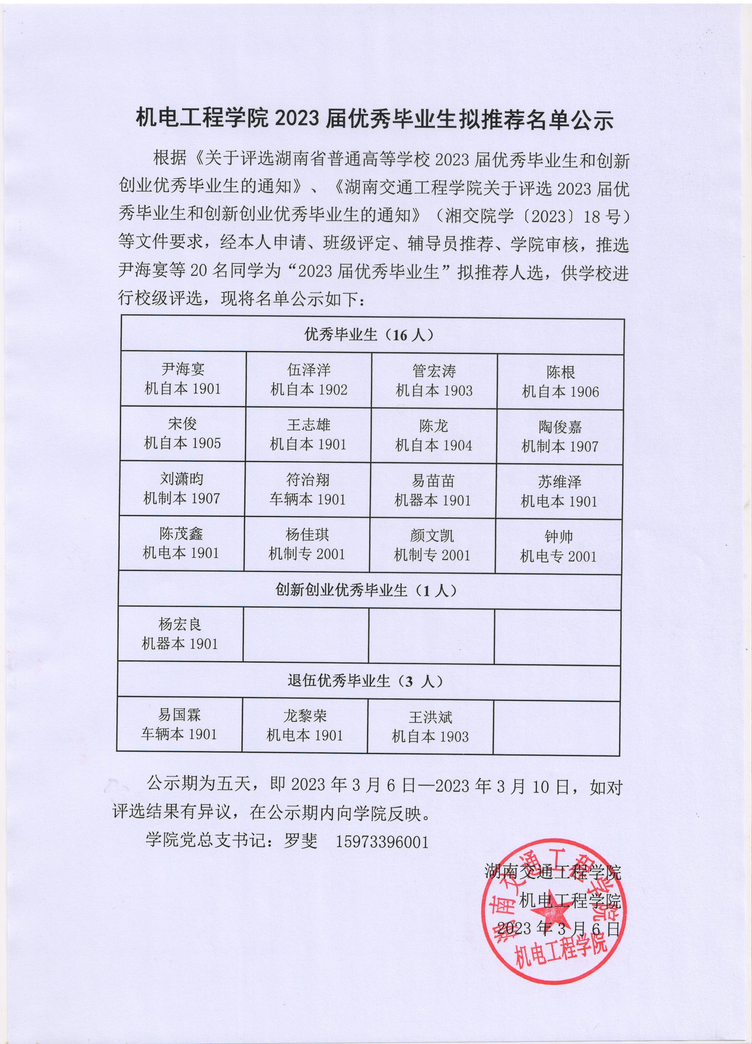 根据《关于评选湖南省普通高等学校2023届优秀毕业生和创新创业优秀毕业生的通知》beat365唯一官方网站关于评选2023届优秀毕业生和创新创业优秀毕业生的通知》(湘交院学202318号)等文件要求,经本人申请、班级评定、辅导员推荐、学院审核,推选尹海宴20名同学为“2023届优秀毕业生”拟推荐人选,供学校进行校级评选,现将名单公示如下: