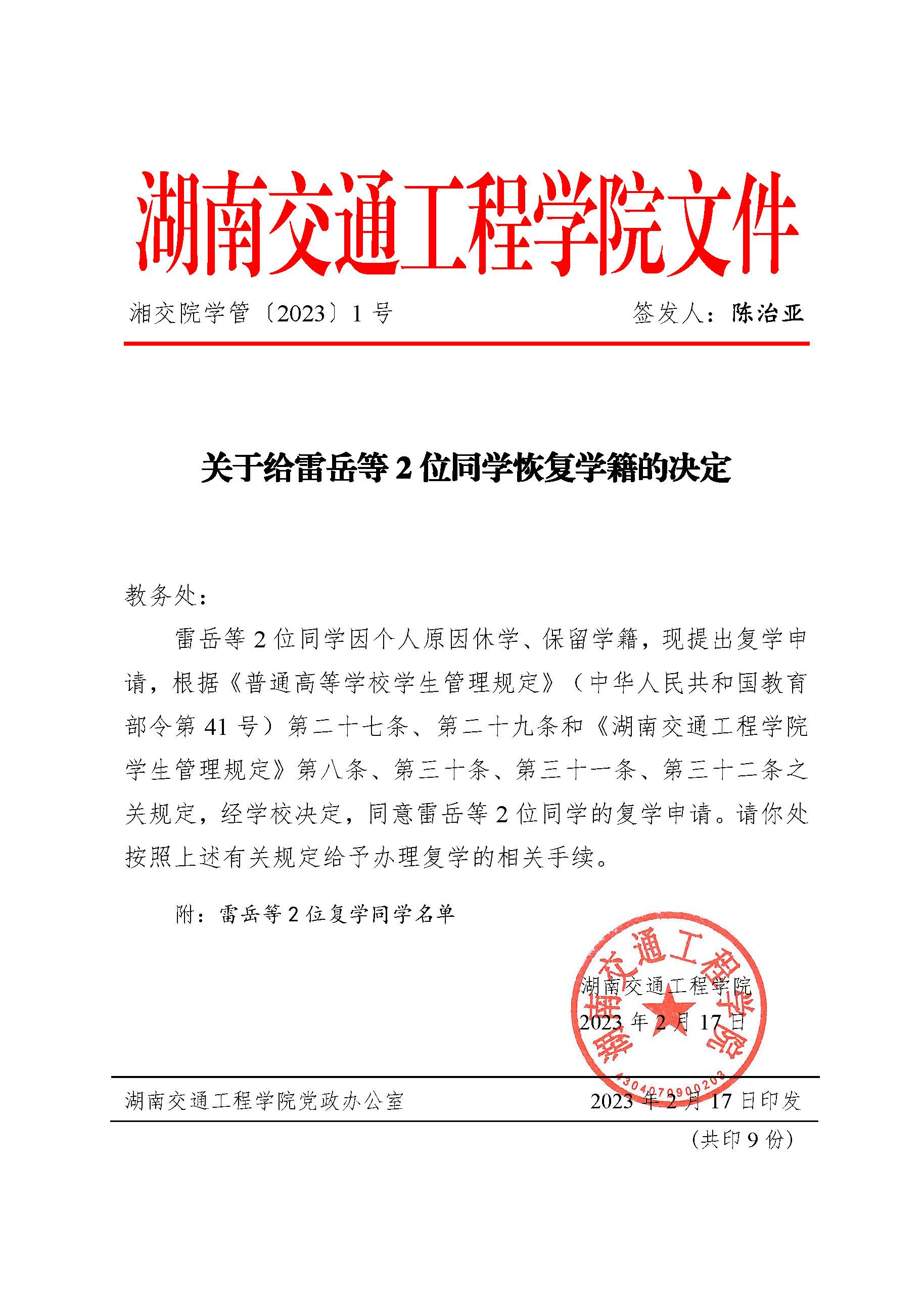 关于给雷岳等2位同学恢复学籍的决定(湘交院学管〔2023〕1号)