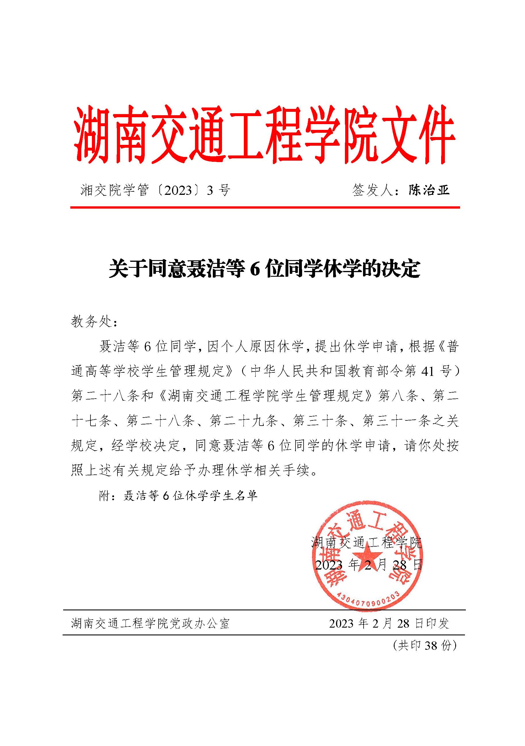 关于同意聂洁等6位同学休学的决定(湘交院学管〔2023〕3号)