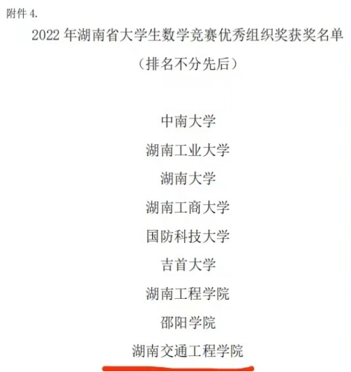 近年来,该校高度重视学科竞赛,形成了完善的工作机制和激励机制,公共基础课部组建了以 老师为负责人的教学团队,免费为学生做考研数学培训,形成了以赛促学、以赛促教、以赛促考(研)、赛学互补的工作模式,对大一学生开设数学学习兴趣班,利用节假日进行系统培训,开启“三结合”培训模式即“线上答疑与线下辅导相结合、定时定点与随时随地相结合、集中授课与个别辅导相结合”,在此基础上筛选参赛苗子,日常教学注重基础、暑期培训强化能力、赛前冲刺提升技巧,全程统筹安排。在2021年全国大学生数学竞赛分区预赛暨湖南省大学生数学竞赛中,该校也荣获非数学类一等奖1项、二等奖4项、三等奖9项。(通讯员 李建华)
