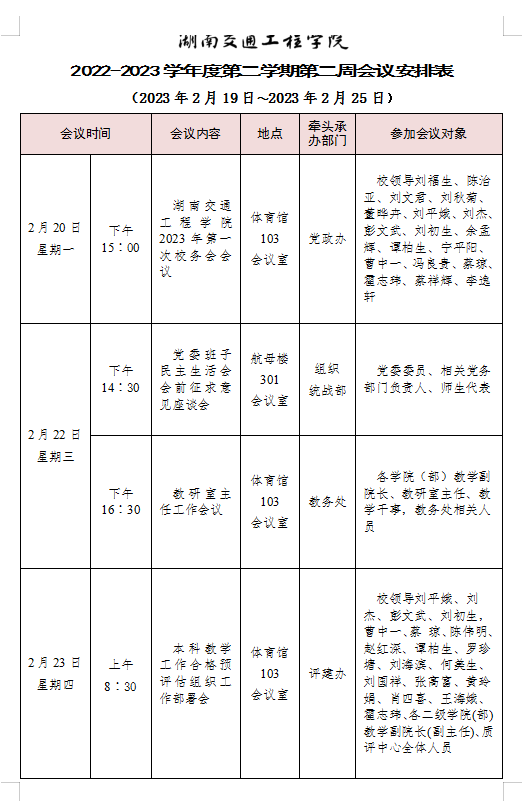 beat365唯一官方网站 2022-2023学年度第二学期第三周会议安排表