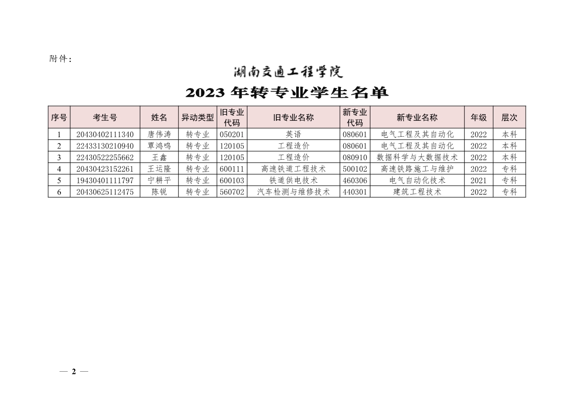关于同意唐伟涛等6位同学转专业的决定(湘交院学管〔2023〕6号)